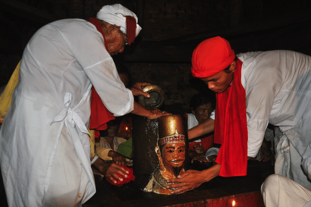 During the New Year holidays (Mbang Ka Te Festival), Cham people host their largest festival in memory of their national heroes and ancestors. Sacred rituals are normally performed around the mukhalingas dedicated to demigod kings. The chief shaman and officers bathe the statue in holy water, present offerings and change the statue’s clothes to honor the ancient kings. The shaman invites the kings and begs them to grant mercy on their offspring. Before opening the towers to perform the mukhalinga bathing ceremony, the Champa shaman tosses a pot of holy water to bathe the Siva statue.