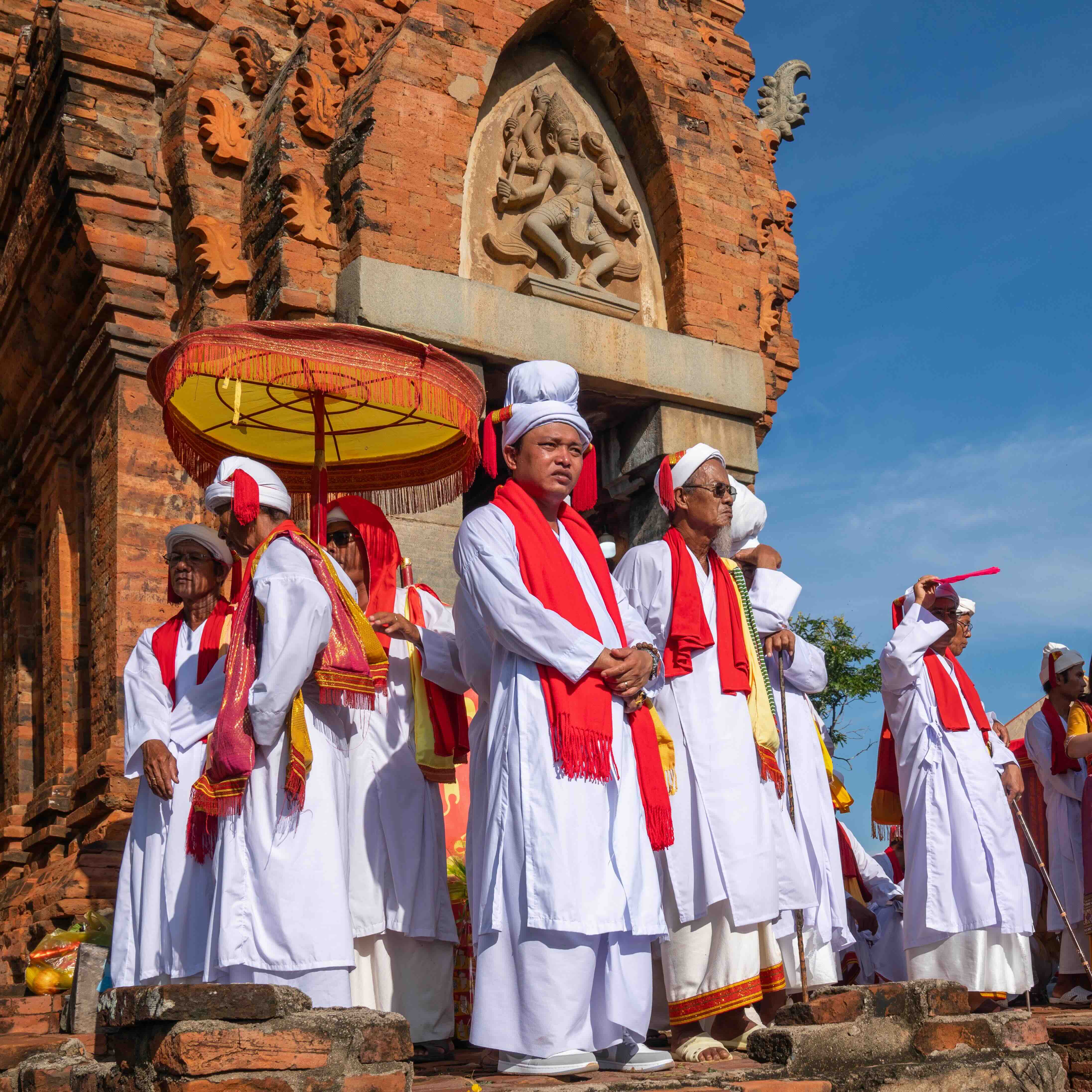 Before the festival day, both Cham and Raglai people hold rituals to welcome and escort the ceremonial garments. Raglai people belong to the Malayo-Polynesian language family and live in mountainous areas in the west of present-day Khanh Hoa and Lam Dong provinces. Raglai villagers from La A village in Dong Ninh Hoa, Khanh Hoa, are responsible for bringing Po Ina Nagar’s attire to the temple tower, while Raglai from Phuoc Ha and Phuoc Huu carry the garments of Po Rome and Po Klong Garai.