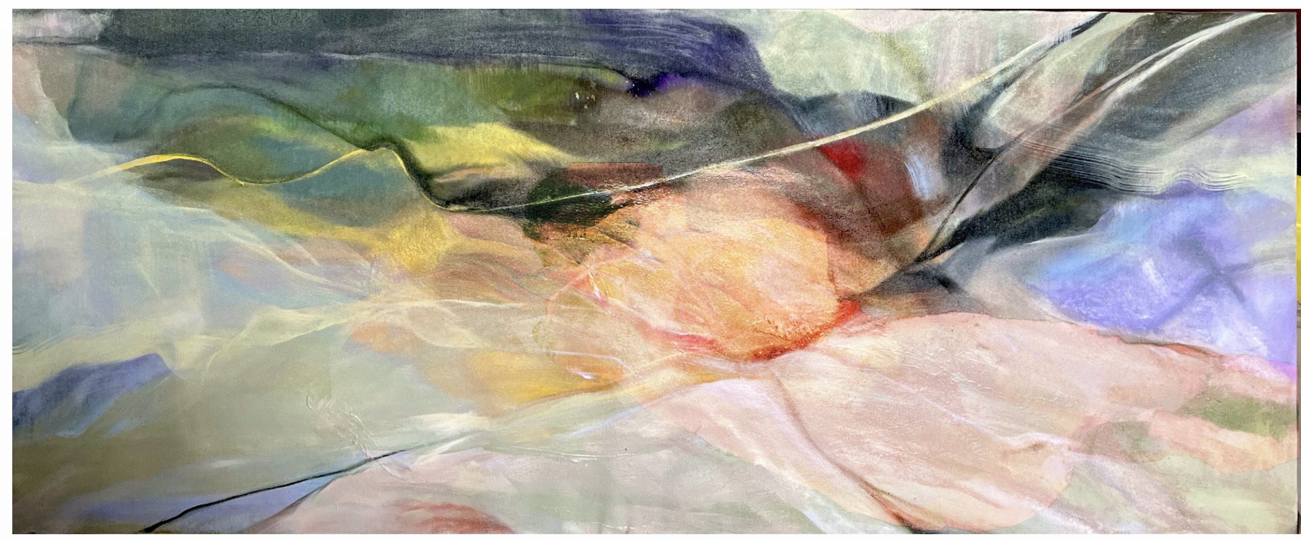 I deluded myself into thinking that I was the second person, after her, to behold these layered paintings in various shades of green. Layers of green overlap with many hues. Through strokes and interplays of color hidden within a vast expanse of deep green, accents of white, orange-red, purple, and yellow emerge, evoking the forms of dragons. The artist has created a sense of space that floats between mystery and clarity, intertwining elements of sky and water, mountains, and sea. This portrayal of the Dragon exists in a realm that is both seen and unseen, real and unreal, blurring the lines between existence and illusion. These are thin ripples of color, seemingly as thin as could be, but layered, both covering and merging with lower layers to the extent that the viewer can feel each layer beneath. These layers contain the depth and contemplation of the painter amidst the blurred echoes of a distant past.