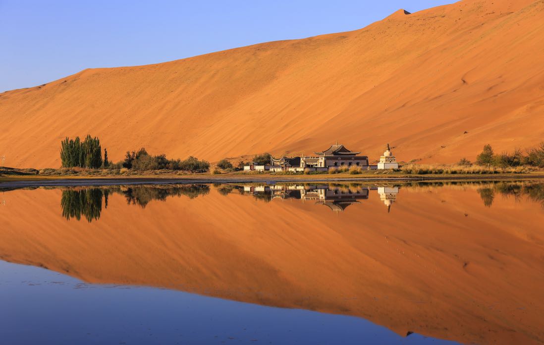 The Badain Jaran Temple is a sacred place for animal herders. Legend has it that it was built by craftsmen of unique skills and it remains the only temple on a desert that has been preserved since the day it was established. The white-walled temple has been dubbed “the palace on the desert,” nestled against the sand dunes and facing quiet and elegant Miaohaizi Lake. The lake’s water contains high salt content, creating a beautiful area of white surrounding sand.
