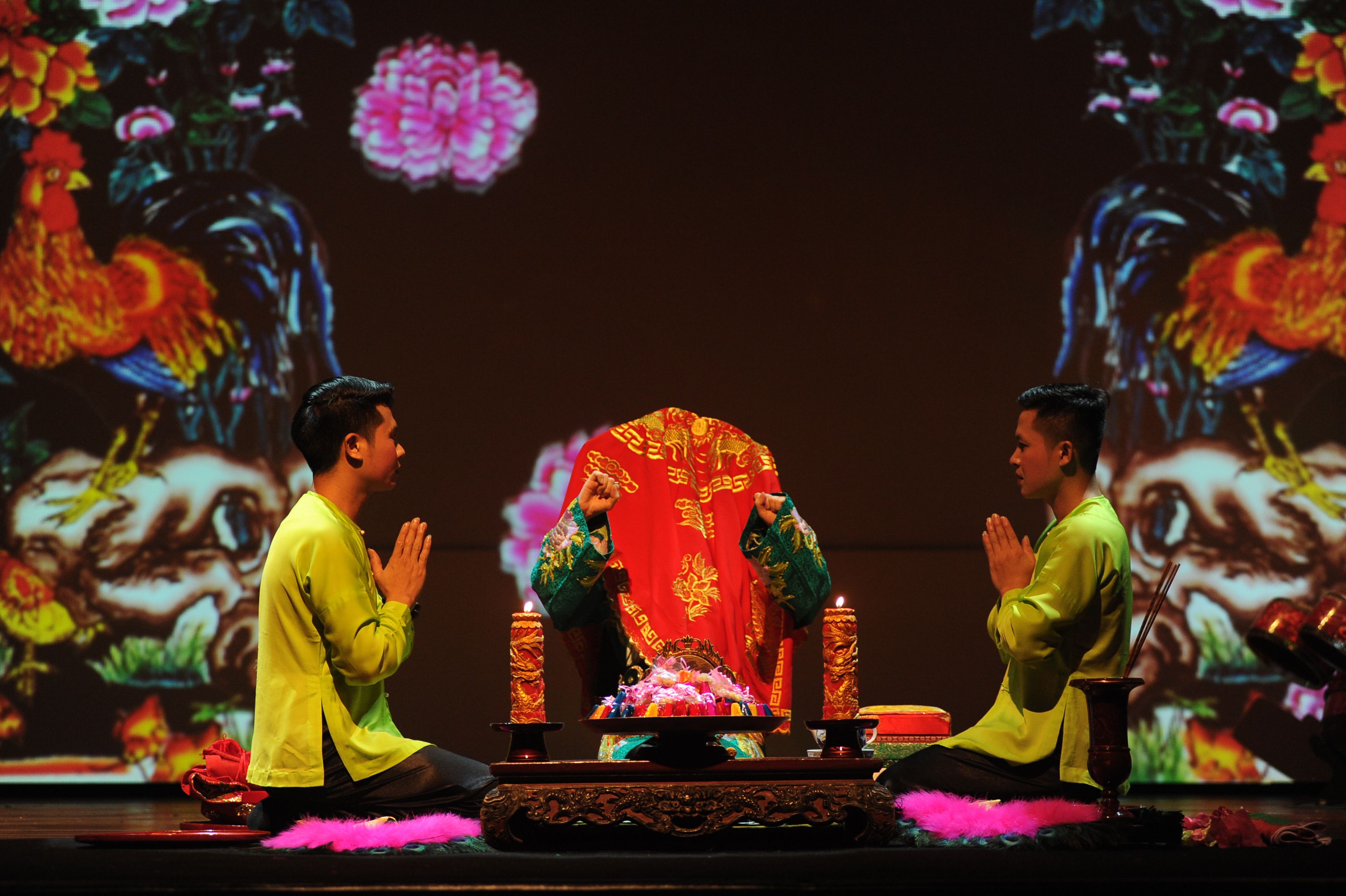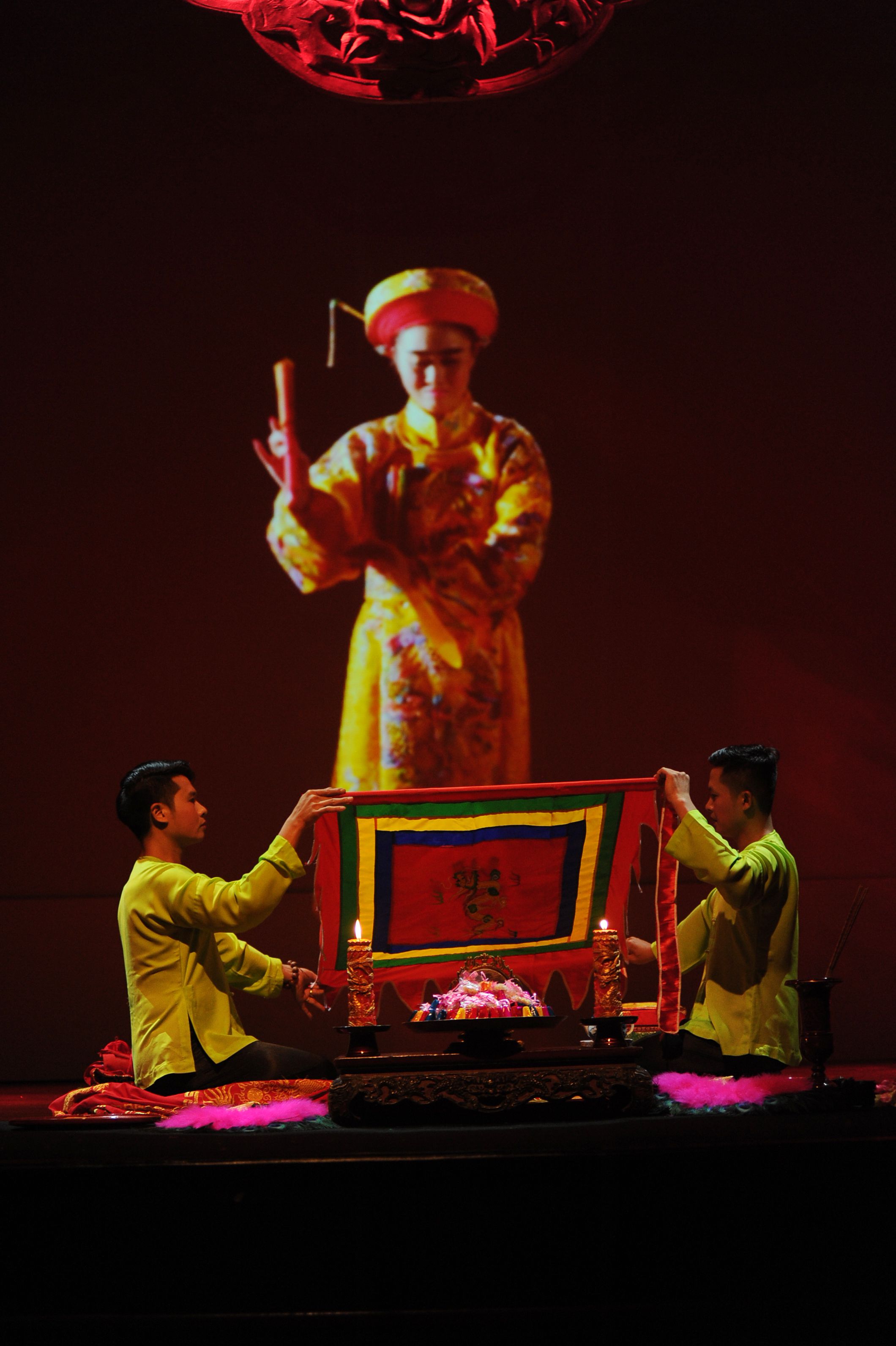 The show is divided into three parts that blend acting and video against a background of electronic music. To bring the audience closer to the actors, the first act is a live video of the actors donning their turbans. A combination of traditional musical instruments breathes new life into the spiritual world of chầu văn. Videos are also used during the play. For instance,in the excerpt “Holy Father Hoang Muoi”, the director used videos so that audience members in the far corners can clearly see the actors’ movements. Video performances are shown while a group of shaman mediums perform at the front of the stage. This marriage of theatre and