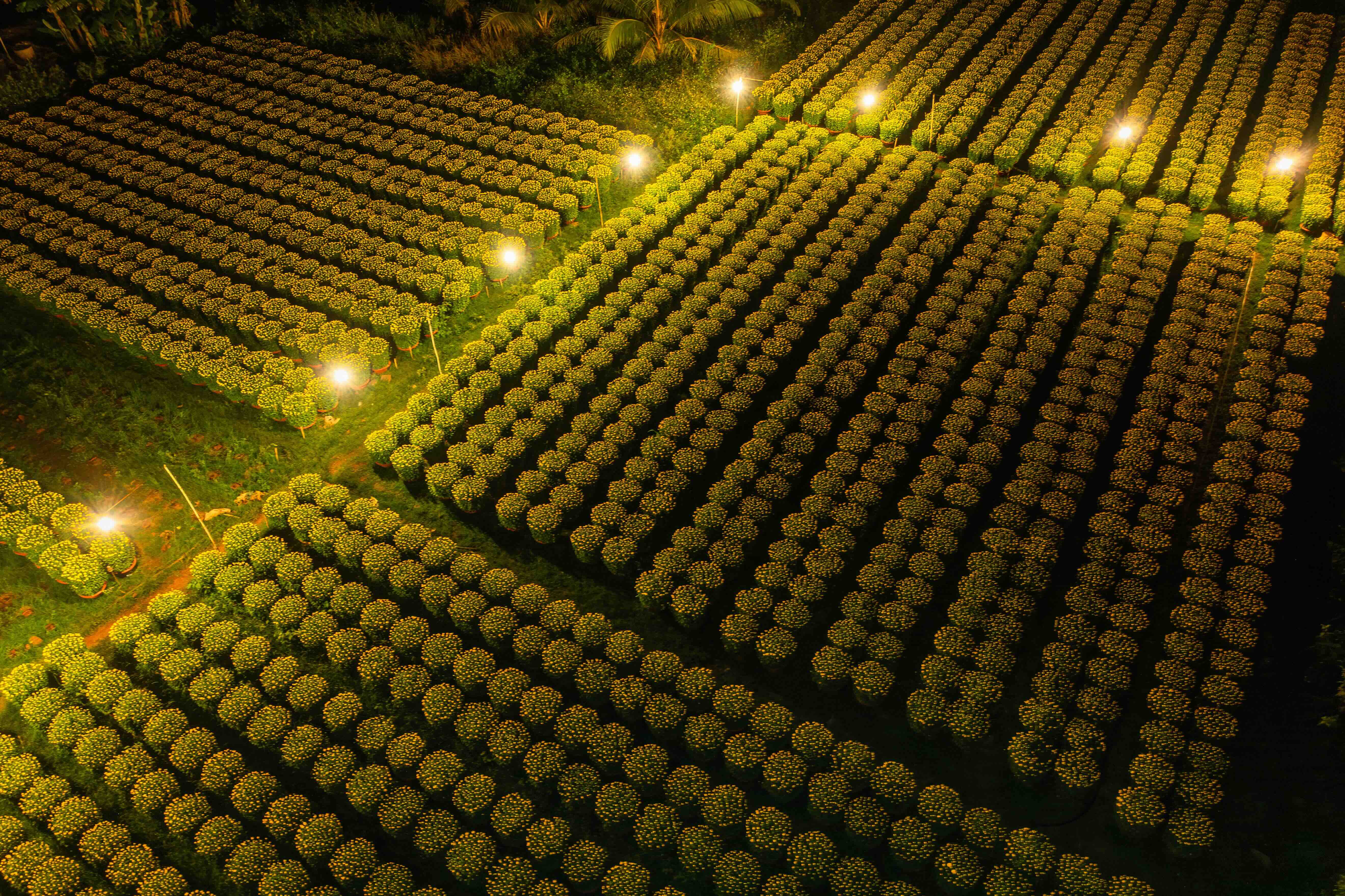 As night falls, the flower village resembles a dazzling festival of lights. Thousands of bulbs glow continuously from 8 p.m. to 4 a.m. the next morning. These special lights prevent the chrysanthemums from blooming too early, ensuring vibrant, golden blossoms that align with the Lunar New Year.