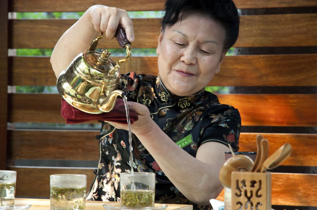 Longjing tea is typically steeped in a cup or a glass tea pot through which the motion and swelling of the dried tea bulbs may be observed. Initially, the tea is put in a glass and soaked long enough for the tea bulbs to swell. The remaining water is then poured into the glass and left for five minutes before the lid is put on. The most salient feature is that the roasting determines the color and shape of the tea leaves, as well as their aroma when steeped in boiling water. Well-roasted tea turns yellow-green and produces a refined aroma when steeped. Hangzhou locals insist that the finest tea is made with water from Hubao Stream, which is boiled and left to cool to 80oC. The pure spring water flows from a canyon and tastes mildly sweet, as the bestowed essence of heaven and earth contributes to its signature aftertaste. When pouring, the tea pot is raised and slowly lowered up to three times in order to stir the tea bulbs without using tools. A handful of tea can be re-used three times, with the second steeping said to produce the best, most aromatic, and most beautifully yellow-green tea.