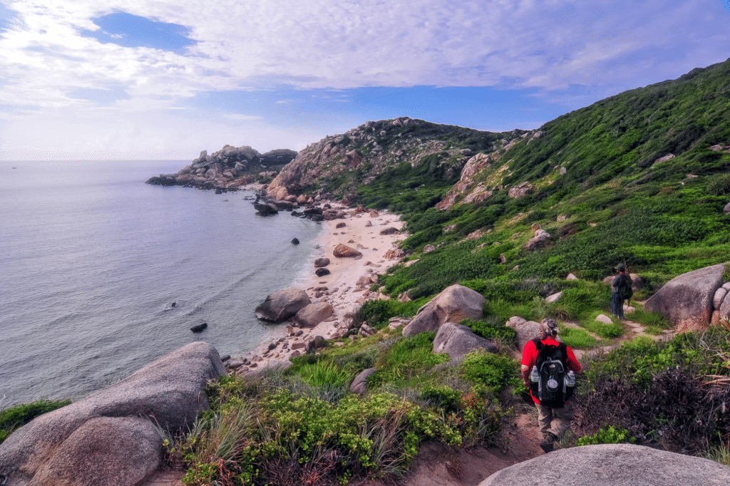 Leaving the thick forest behind and crossing the dunes, the easternmost tip of mainland Vietnam comes into view. Rocks of all sizes cover the beach, piled on top of each other to create a magnificent scene. On these slippery rocks, hikers must take care. The piles of rocks look ready to collapse at any moment, like a scene in the action film “127 Hours”. Upon reaching the last cliff one can see Hon Doi Peninsula and the warm rays of the rising sun.