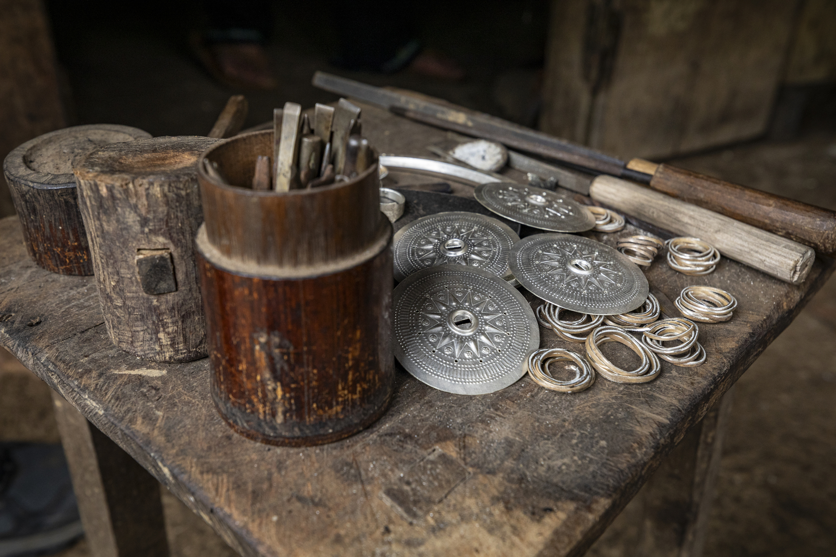 Ethnic Dao Tien people in Cao Bang province are known for their unique and stunning traditional clothes. They have long produced exquisite decorative items and jewelry from silver. Through ups and downs, only one traditional Dao Tien silver-engraving artisan remains, Mr. Ly Phu Cat, now 57 years old, from Hoai Khao village, in Quang Thanh commune, Nguyen Binh. For Mr. Cat, silver-carving is not only a way to earn a living but also a means of preserving the identity and soul of the Dao Tien people. He has moved out of the village and built a small house in a quiet forest to practice his silver-engraving craft. Every day, in his small house in the Phia Oac mountains, he diligently creates sets of traditional jewelry with his skillful hands. The steady tapping of his tools expresses his love for this ancestral craft and his passion for his culture.