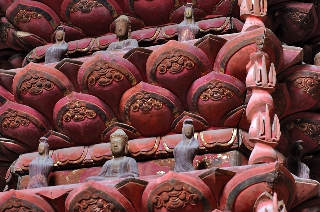 Colossal nine-storied Lotus towers subsequently became symbols of Buddhism. Although their popularity was incomparable to Amitabha Buddha statues or Guanyin statues, only historically acclaimed pagodas overseen by famous head monks were able to erect these towers. Thanks to the profound practice of devoted monks, a new form of tower was launched: spinning nine-storied Lotus towers, colloquially called “Spinning mortars”. These towers were built of wood, measured eight to nine meters high, were placed in scripture halls with traditional architecture, and featured two or three layers of upcurved roof tips. Their foundations were not fixed to the ground, but placed on a bronze mortar that allowed the towers to spin. The wooden pedestals were elaborately decorated by craftsmen. Their bodies were carved with bas-reliefs that depicted Buddhist tales. The arms supporting a towers’ stories were shaped like dragon carvings. Each story was carved into a lotus pedestal. Each lotus petal carried one of multiple Buddhist statues, Guanyin statues or Alahat statues. Each statue was a lively work of art. The tower in Dong Ngo Pagoda boasts up to 162 statues.