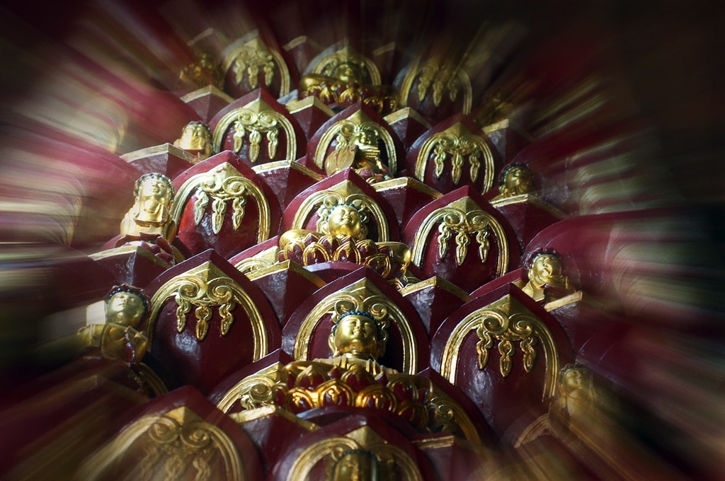 The towers host crucial rituals performed by Buddhist monks who pray for mortal salvation in the middle of every month, particularly Lunar mid-July sacrifices (pardoning the sins of the departed). During these rituals, monks and Buddhist faithful all walk around the towers with their right hands facing the sacred statue. This practice was derived from Indian customs of presenting homage. Buddhists believe that walking around the tower three times pays sacrifice to the three Jewels; obliterates the three evils; purifies the three karmas (body, mouth and thoughts); and eradicates the three demonic forces. Each reincarnation is an encounter with the three Jewels. Walking around the tower seven times helps to eliminate seven sins (three of the body and four of the mouth) and achieve seven qualities of awakening (Bodhi). Ten rounds help to eradicate Ten fetters and obtain Ten wisdoms. One hundred rounds help to eradicate one hundred sorrows and achieve one hundred doctrines, etc. To walk around Buddhist symbols such as Amitabha Buddha statues or towers, particularly nine-storied Lotus towers, is extremely important, because as long as Buddhists practice and pay homage, their souls will concentrate on a single goal and feel inner joy. Siddhartha Gautama taught that: “to walk around a tower grants practitioners five fortunes: firstly, a fine look in the afterlife, secondly, good fame, thirdly being born in the heavenly realm, fourthly being born in a royal family, and finally salvation in Nirvana”.