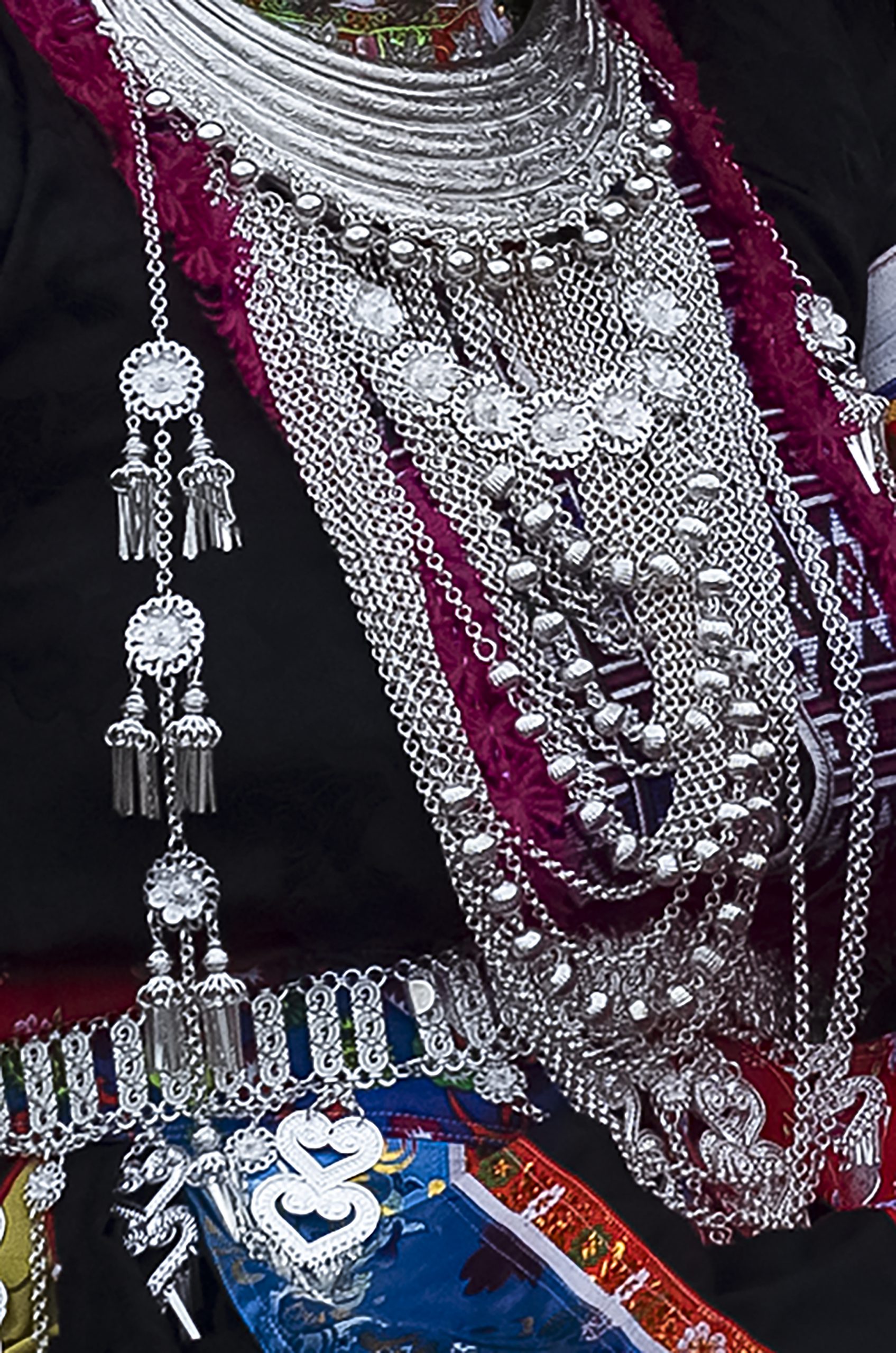 The Red Dao preserve their traditional heritage by wearing their traditional clothes. Because Red Dao girls are taught to sew by their mothers and grandmothers from a tender age, every Red Dao woman can make her own clothes and clothing for her family. Red Dao men wear plain and dark clothes. When the weather gets cold, they usually don berets and bright scarves. Women, on the other hand, dress in bright and intricately decorated clothing. They add many delicate decorative touches to their dress’s placket, sleeves, chest, and waist, and to their trousers’ hems. The most common decorative motifs are plants and flowers. Red Dao women typically wear dark clothing underneath, accentuated by intricate ornamental details such as long strips of fabric wrapped around their dazzling brocade skirts. As well as adding patterns to their chests, they wrap colorful beads around their waists. On special occasions, Red Dao women adorn their necks and hips with shiny silver jewelry. In terms of headgear, the women in this region often wear a round man and a brocade scarf with upward-pointing ends. They also wrap a pink or multi-colored tasseled scarf behind their back to complete their harmonious and stylish ensemble.