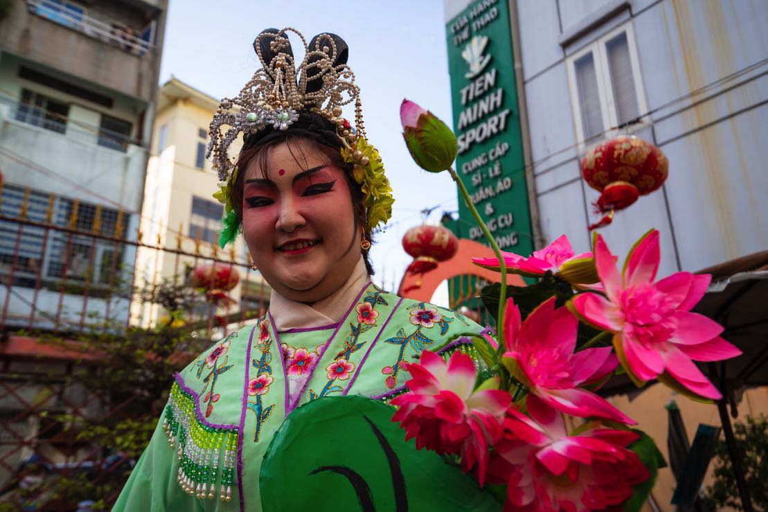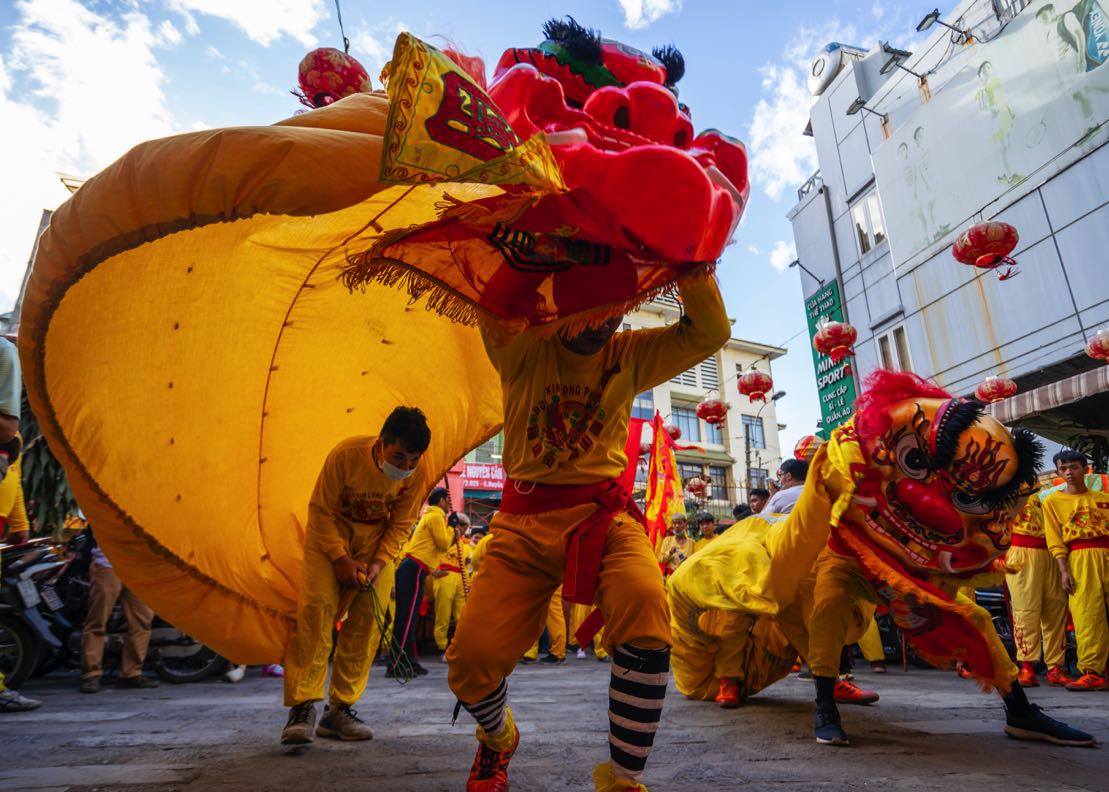 In addition to the street parade, the Lady and Lord Pagodas on Nguyen Trai Street in District 5 also draw their own share of visitors. While Saigonese people call it “Lady Pagoda” (chua Ba), unlike in an actual pagoda, no Buddhas are worshipped here. Its real name is the Tue Thanh Assembly Hall, for the worship of Lady Thien Hau, who is said to bless and shelter the unfortunate. Hoa people typically visit on the first full moon of the lunar year to wish for peace and happiness for their loved ones. The hall’s courtyard is designed so that coils of incense can be hung here, each bearing a piece of red paper listing the names of family members to wish them peace and prosperity. In the early spring mornings, when the air is crisp and cool and the light is pure, the incense coils hung around the courtyard resemble a work of art. Photographers arrive in droves to capture such moments.