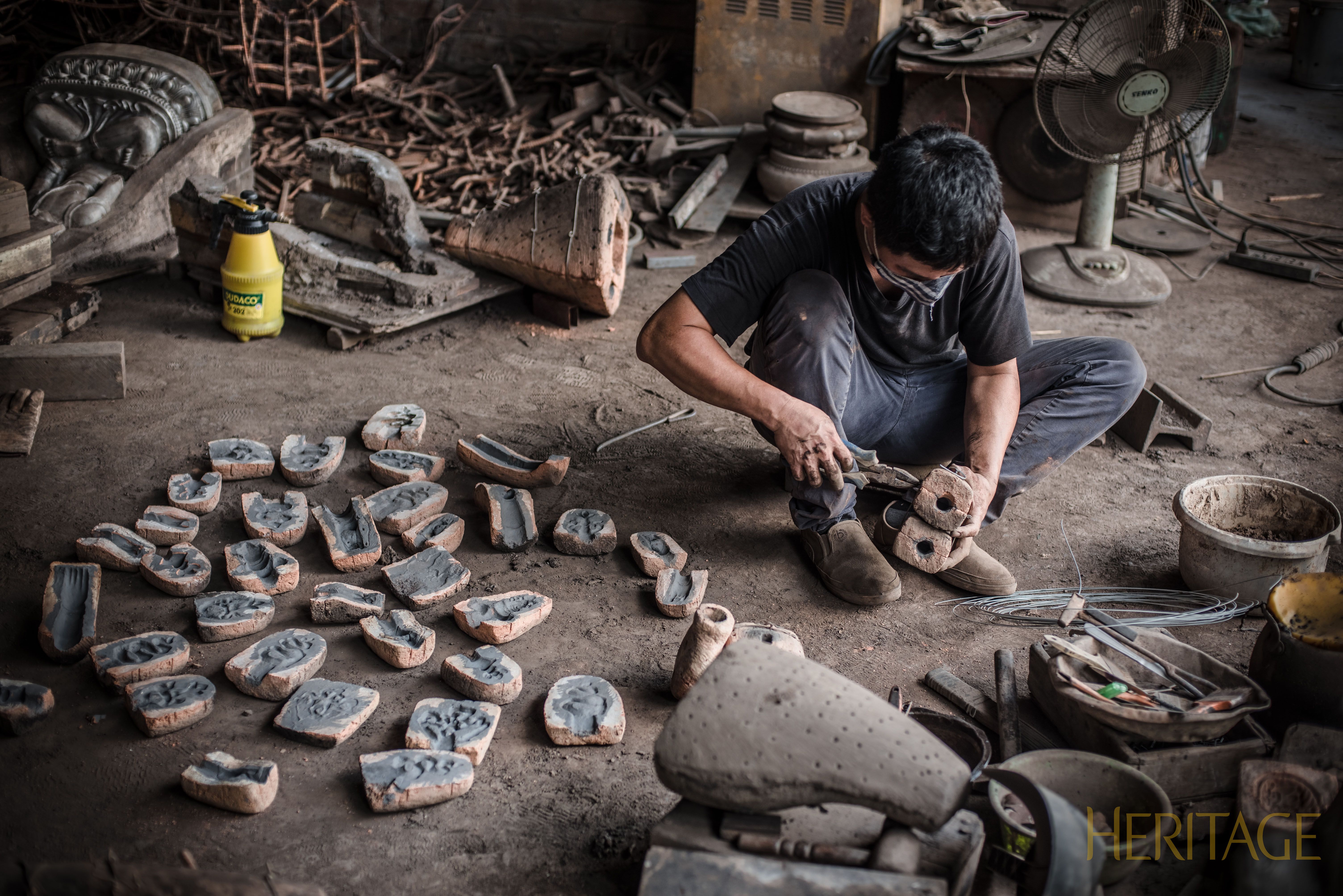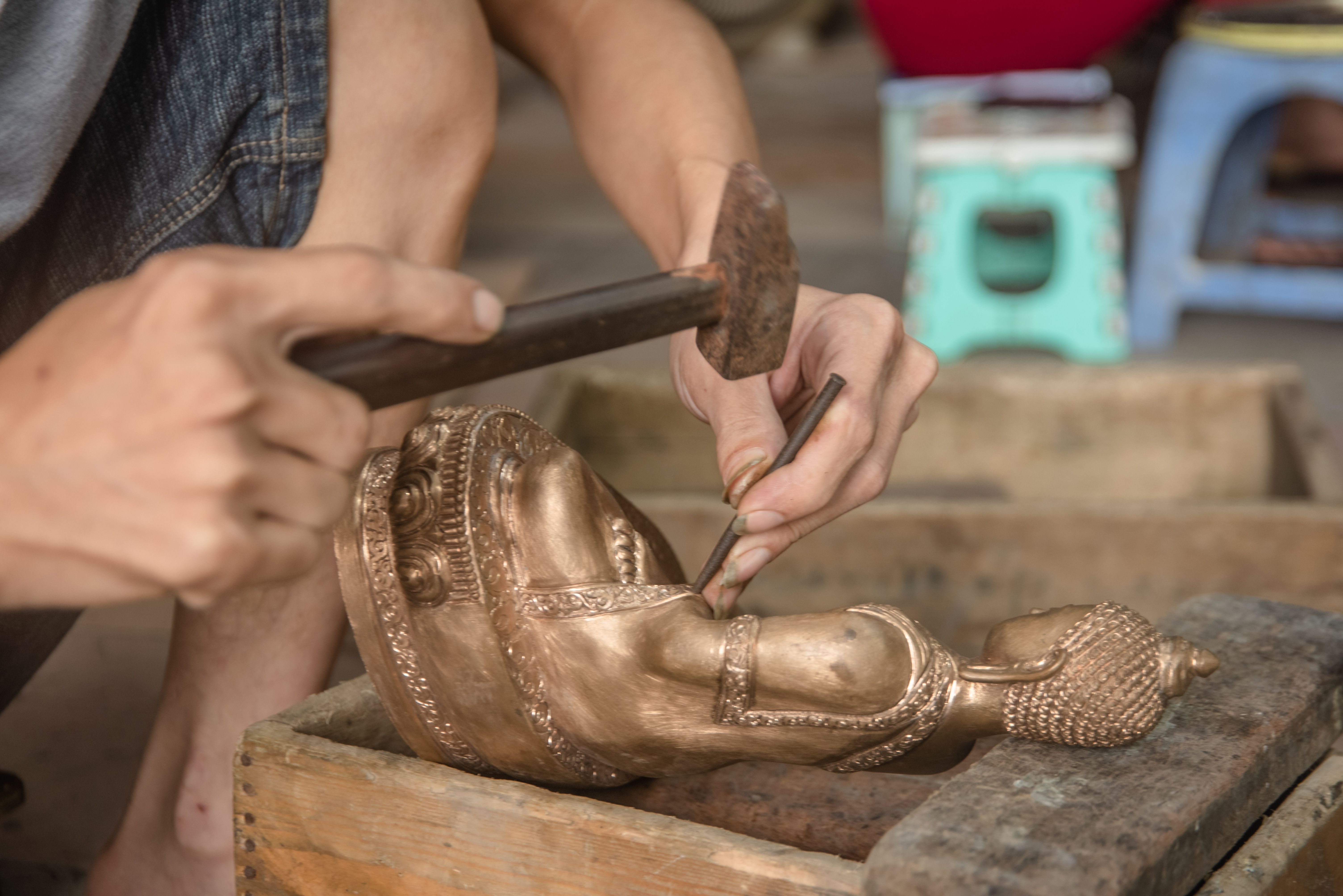 Bronze-casting requires great skill. A good bronzesmith must master all five stages: shaping and modeling; moulding and casting: preparing, melting and pouring the copper into the mold; correcting and engraving after the mixture has cooled; and polishing. Although the mold is created with great care, it can only be used for one product. To date, only the polishing step is done by machines. The other stages are still done by hand.