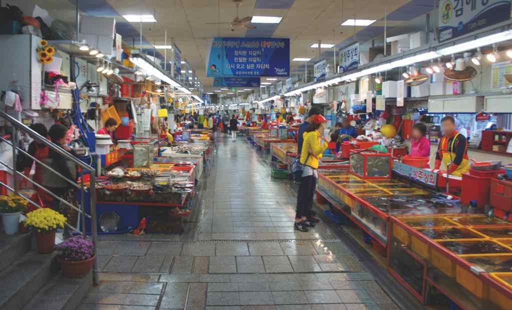 Seagulls are one of the distinctive features of the coastal city of Busan, and are the inspiration for the design of the Jagalchi Fish Market, which is famous for its fresh seafood and must-try delicacies. The market is packed with traditional seafood stalls but maintains cleanliness both inside and outside, as owners promote their wares to customers in booming voices.