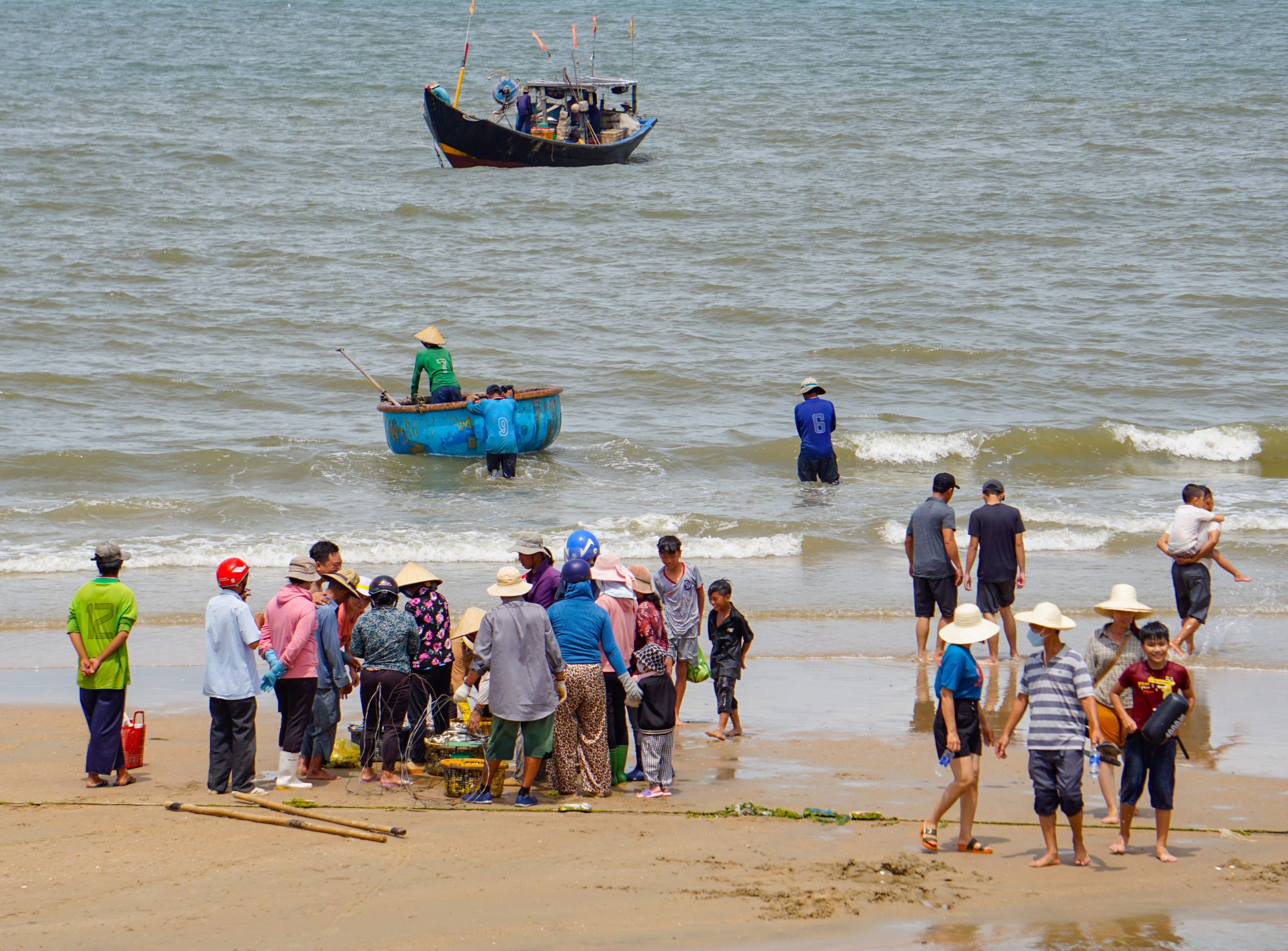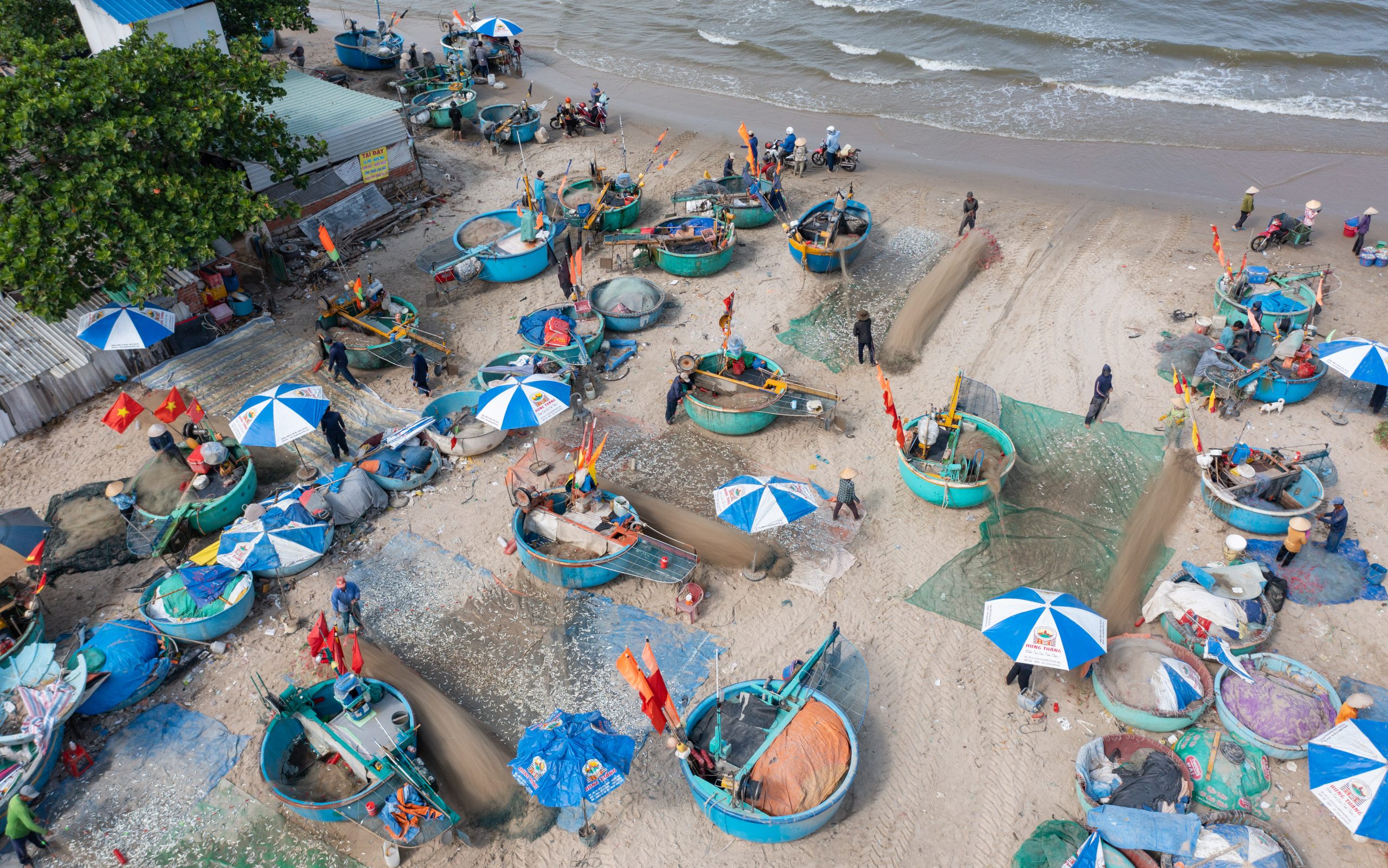 On the beach, right at the foot of the waves, many fishermen are busy mending their nets and sorting their fresh catches, with coracles lined up neatly on the sandy shore. From higher viewpoints you can see distant boats loaded with fish and shrimp returning to port, where crowds of loved ones anxiously await the return of their husbands and sons. After a rough journey at sea, when they haul in a good catch, the fishermen’s smiles are so bright that onlookers can’t help but feel happy too.