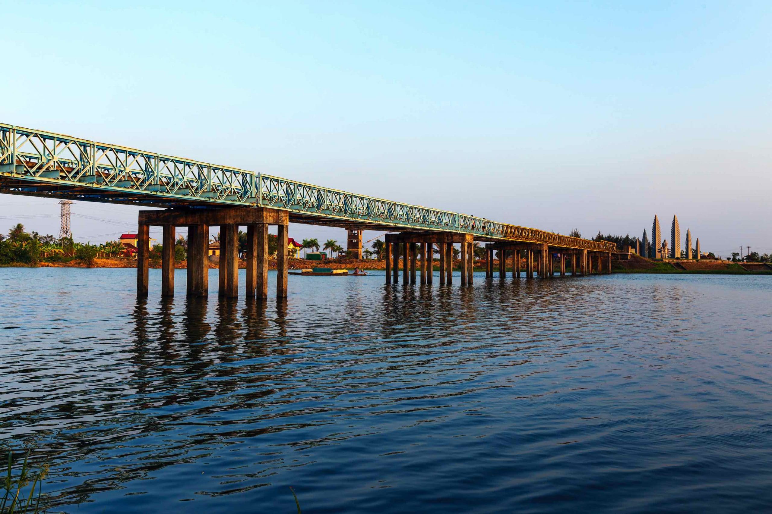 When driving north to south on National Highway 1A, upon leaving Vinh Linh and crossing the Ben Hai River to Gio Linh, look left to see a unique green and yellow seven-span iron bridge with an iron-wood floor stretching across the blue river.