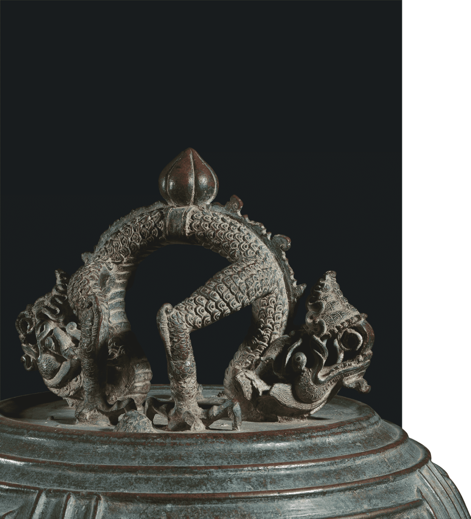 According to legends, Pulao Dragons are marine creatures that are very afraid of Fish Monsters. When chased by Fish Monsters, they emit terrifying screams. Ancient people typically carved Pulao Dragons onto bells and modelled the mallets to look like Fish Monsters to ensure that the struck bell’s peals would carry. In Vietnam, Pulao Dragons were generally depicted as having two heads.
