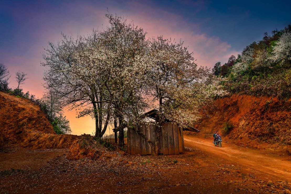 I followed a red dirt road that meandered through hills covered with blooming hawthorn flowers to reach the residential area of Nam Nghiep Village, where homes are perched on high hills. Despite their difficult circumstances, the locals are full of life. Women and children wear ornate and colorful handcrafted clothing, but it is their smiles that stand out the most. The children in the village have white teeth, plump and rosy cheeks, and clear, sparkling eyes. I enjoyed watching them laugh and talk to one another, as well as occasionally joining in to play small games. My heart was filled with joy and peace. When the children saw my camera, they covered their mouths, giggled, whispered, and dashed behind the old hawthorn trees one after another. As I became more familiar, they showed me the largest flowering trees high up in the hills, where I could hunt for spectacular sunsets and feel as if I could touch heaven with my own hands.