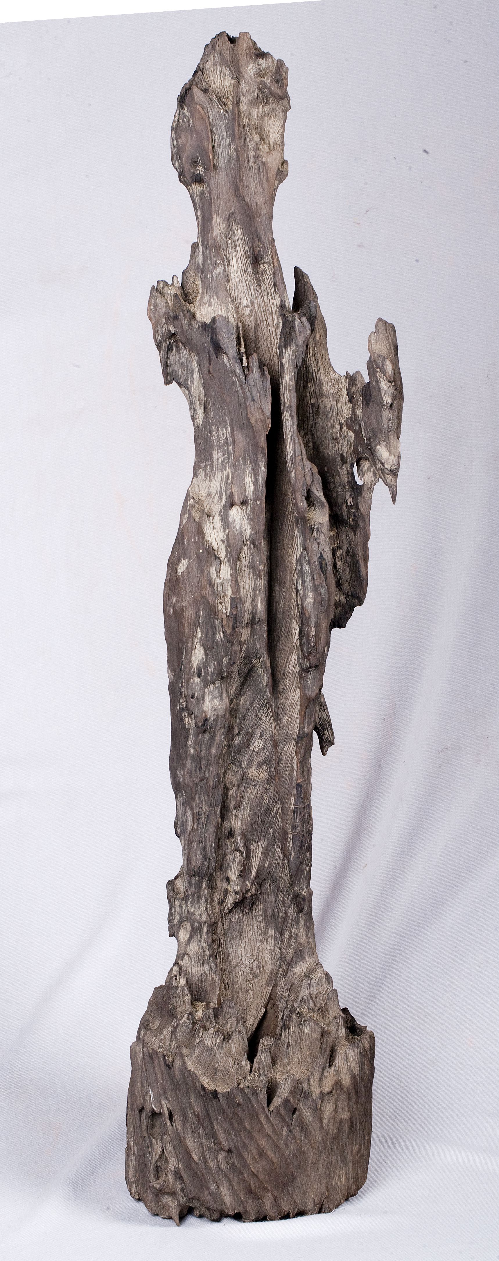 A striking and salient feature of Phu Nam Buddhist sculptures are statues of Siddhartha Gautama standing on a lotus pedestal. These statues were carved from monolithic blocks of Ta-khian or balltree timber. Most of these remaining wooden statues have lost their arms. Some intact relics feature hands performing the gestures of Abhya and Varada. At the early stage (2nd to 4th centuries), wooden Phu Nam Buddha statues were depicted in the Tribhanga pose with their hips heavily skewed to the right. Their bodies were slender and slightly bent into three graceful and sensual segments. This depiction was influenced by the artistic style of Indian Amaravati. However, one can still discern some distinct local features of these figurines. The Ushnisha (a 3D oval at the top of the head, representing a top-knot) was portrayed more loosely or looked sharp. The figures had oval faces, tall necks and flat chests. These statues were shown in thin and figure-hugging robes that highlighted their curves, rather than being wrapped in heavy robes as in the Amaravati style. From the 5th to early 6th centuries, wooden Buddha statues shifted to the Abhanga pose as their hips were only slightly skewed to the right. Their upper body was straight and lacked the sensual qualities found in Tribhanga Buddha statues. Their faces were portrayed in a number of shapes such as oval or square. These characteristics followed the Indian style of Gupta. In the 6th century, wooden Buddha statues underwent another transformation inspired by the late Guptastyle. These statues were shown standing straight. The body was stiffer and rougher than before. Their robes covered one shoulder and hung loose to the ankles. The faces were not much different from those in previous stages. Local influences on the Gupta artistic style could be seen on the statues’ robes, which covered just one shoulder. The original India Gupta Buddhist statues had both shoulders covered and robes with layered folds.