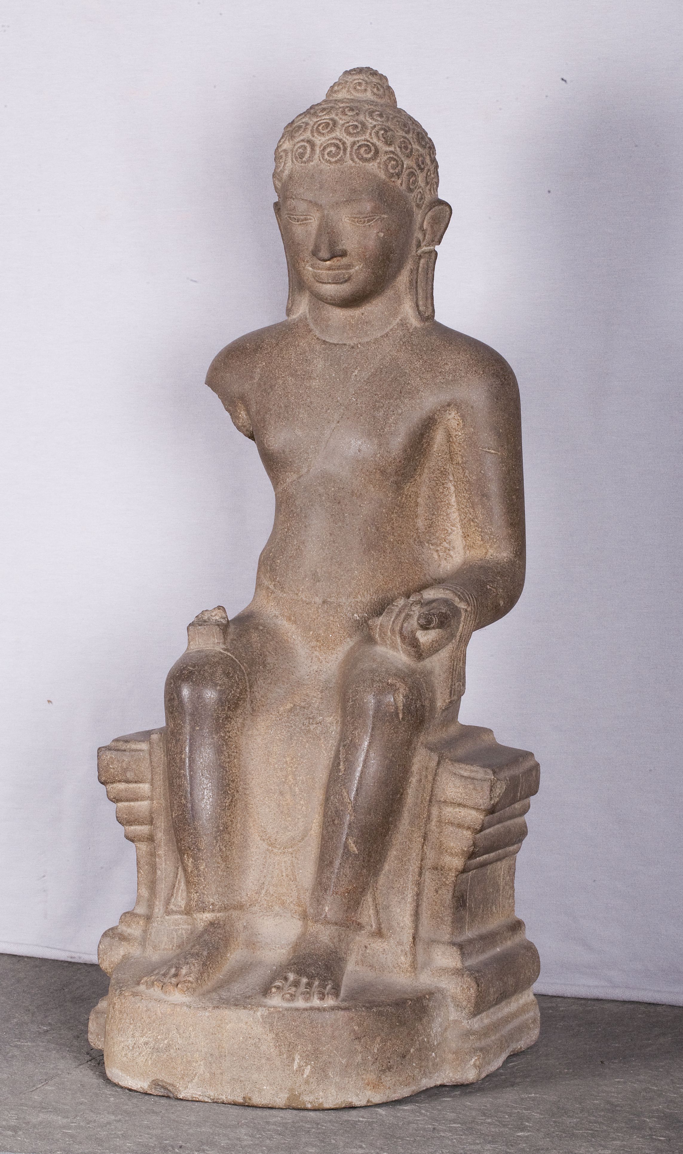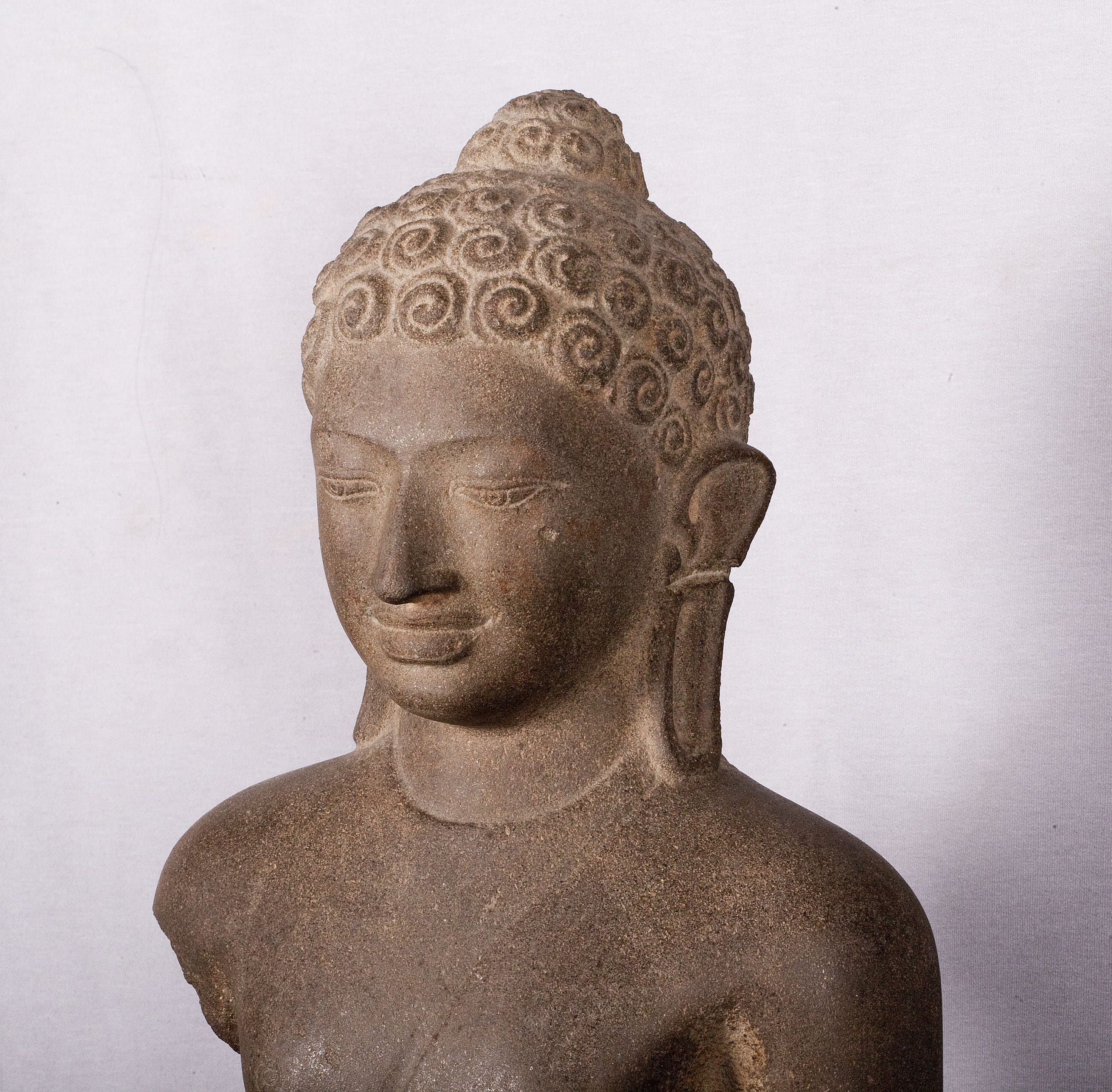 In contrast with wooden statues, Phu Nam stone statues were mostly portrayed in the mediating Padmasana posture with both hands in the Zen gesture of Dhyana, which symbolized enlightenment. The harmonious figures were carved with great subtlety and sensuality. Their faces were full, the eyebrows long and slender and their eyes cast down to show benevolence. Thin robes hugged their bodies. These statues were inspired by the late Gupta style of the 6th to 8th centuries, but further simplified with curves that were more subtle.