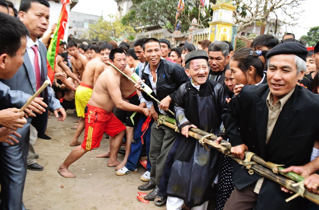 In Vietnam, ritual tug of war games are most popular in the midlands and in the Red River and Northern Centre, all cradles of Vietnam’s wet rice civilisation. These games are enjoyed in the provinces of Vinh Phuc, Bac Ninh and around the capital, Hanoi. This game is also frequently practiced by ethnic minority groups in the Northern Highlands of Vietnam including the Tay, the Thai and the Giay in Lao Cai province, who were early cultivators of rice. The tug of war remains the most popular folk game thanks to its simple and unique rules, which appeal to both players and cheering spectators. Tug of war games are no longer restricted to festivals but are played in public parks and in village courtyards.