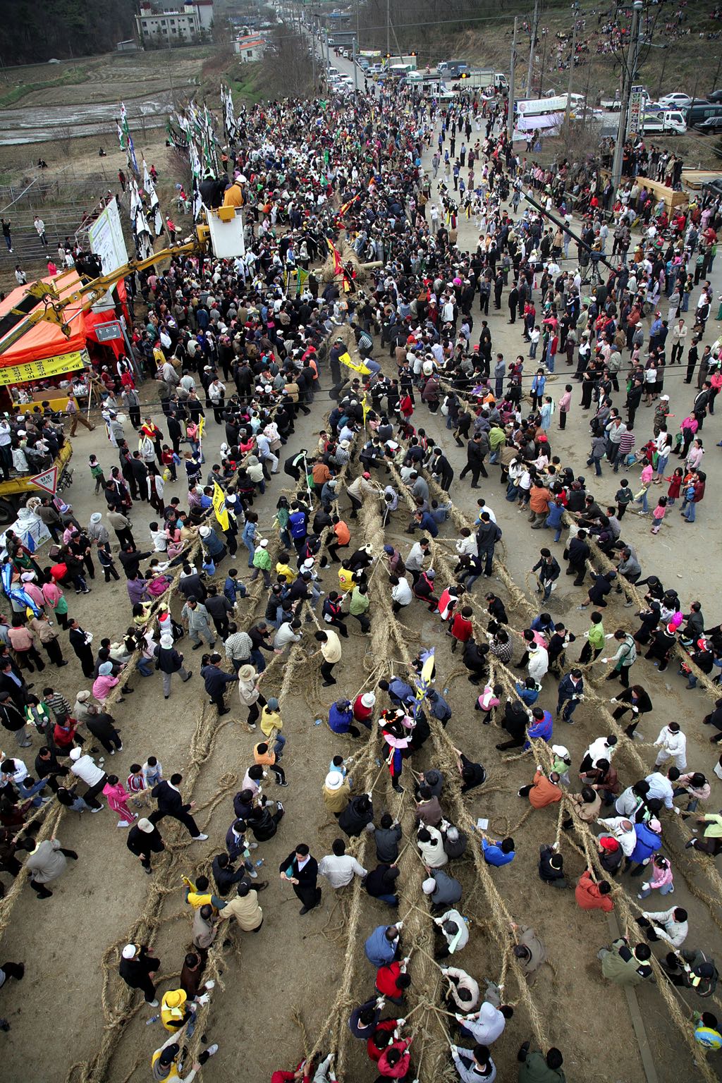 In Korea, many towns in agrarian areas play ritual games of tug of war. This practice is particularly prevalent on open plains such as those in the southwest of the Korean Peninsula. Localities famous for tug of wars include the farming areas of Dangjin, Namhae, Milyang, Uiryeong, Changnyeong, as well Samcheok, where residents fish and grow rice.