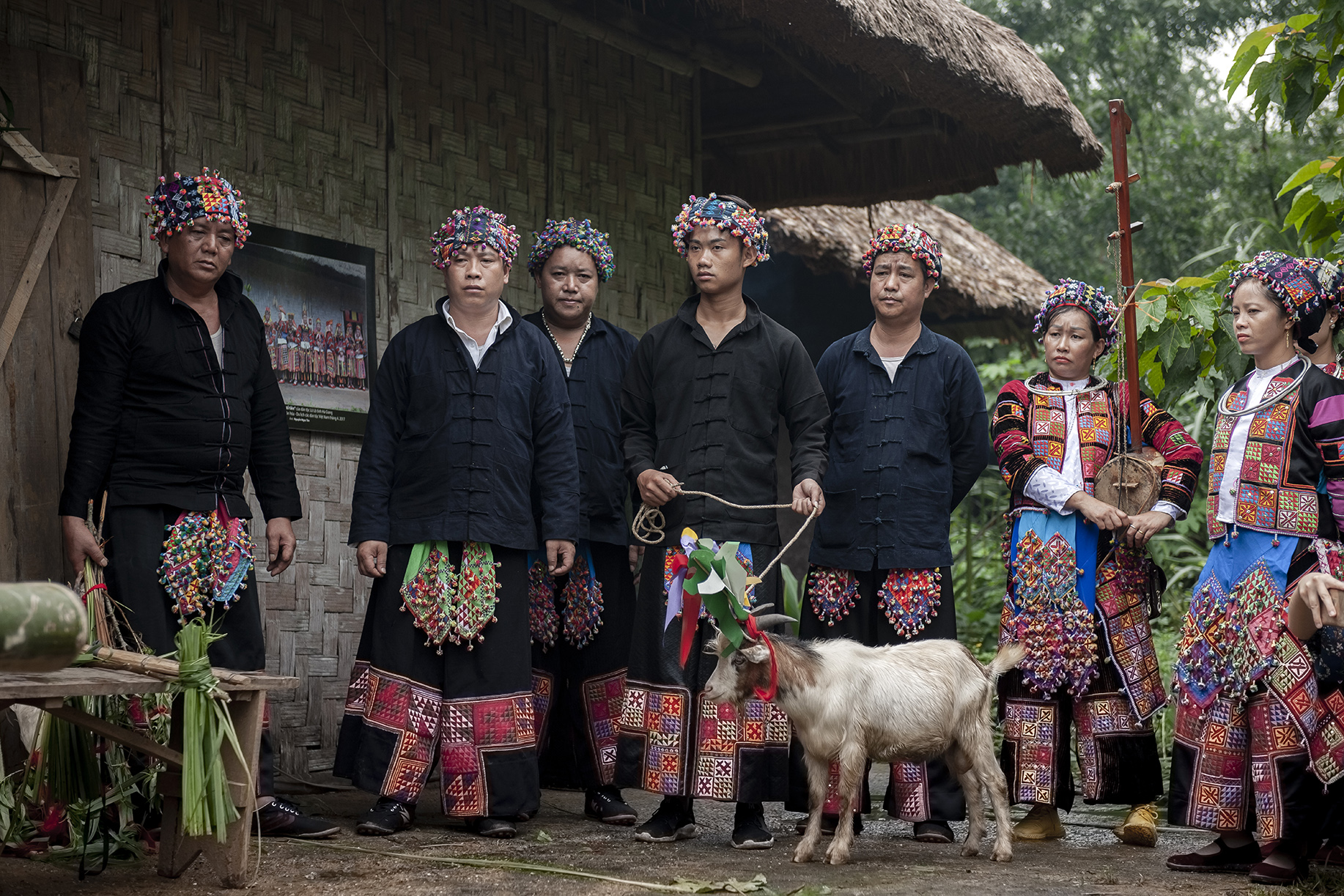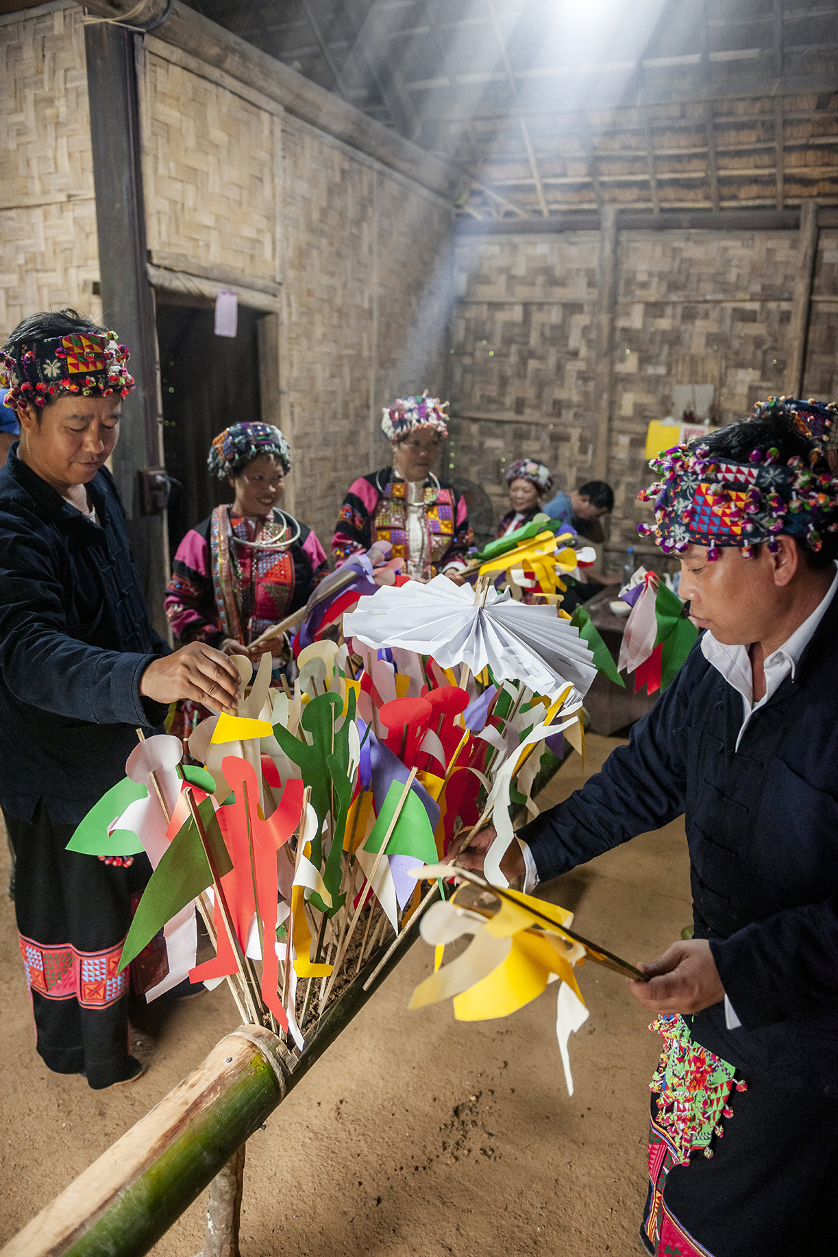 The group performing the ritual includes a main shaman and a secondary one, accompanied by supporting male villagers. The group goes from house to house, to every corner of the village, beating gongs and drums loudly to wake up the good that is still asleep and drive away the bad. The sounds of gongs and drums are believed to scare away evil spirits. The men carry offerings consisting of two goats (their smell is thought to ward off evil spirits), a white rooster, corn wine, corn kernels, bundles of grass, wooden swords, iron swords, three hardy sugar cane stalks, three peach branches, three plum branches, a red cloth, a pair of buffalo horns, and a long piece of bamboo. The bamboo is chiseled in the middle, and filled with soil. Figures made of colored paper are glued onto sticks and stuck in the bamboo. The figures are shaped like beggars to represent evil spirits’ fear for humans. Four “legs” are stuck into the base of the bamboo to represent a horse.