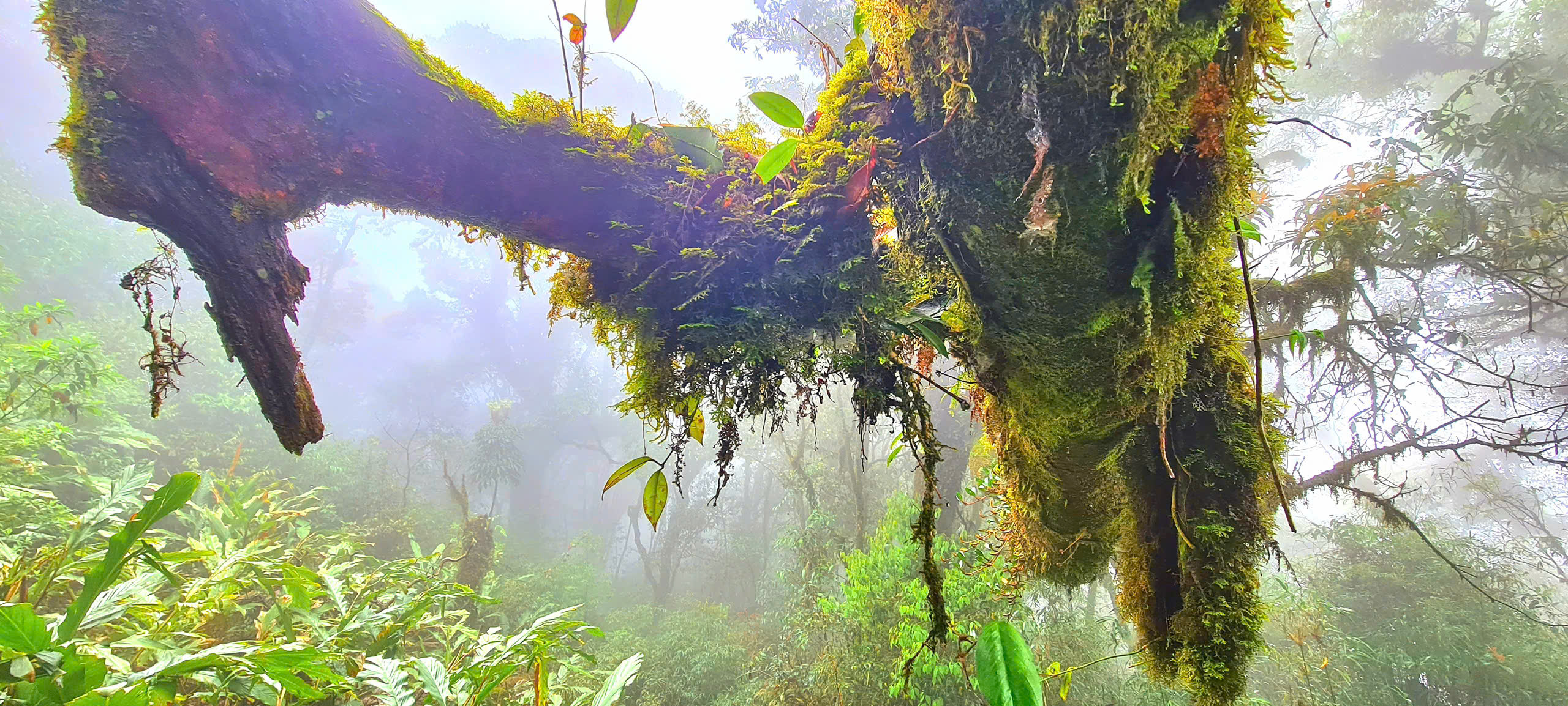 Three hours of continuous climbing brought me to a small cardamom hut nestled deep in the forest – a rest station for local farmers. Around it, vibrant rhododendrons were in full bloom. At an altitude of 2,200 meters, only pink and white varieties thrive, while those of deeper hues grow higher up. The towering old trees filled me with awe, their vast canopies spread wide yet never intertwined, leaving pockets of sunlight to nourish the plants below. It felt like nature’s quiet conversation, a perfect harmony of coexistence.