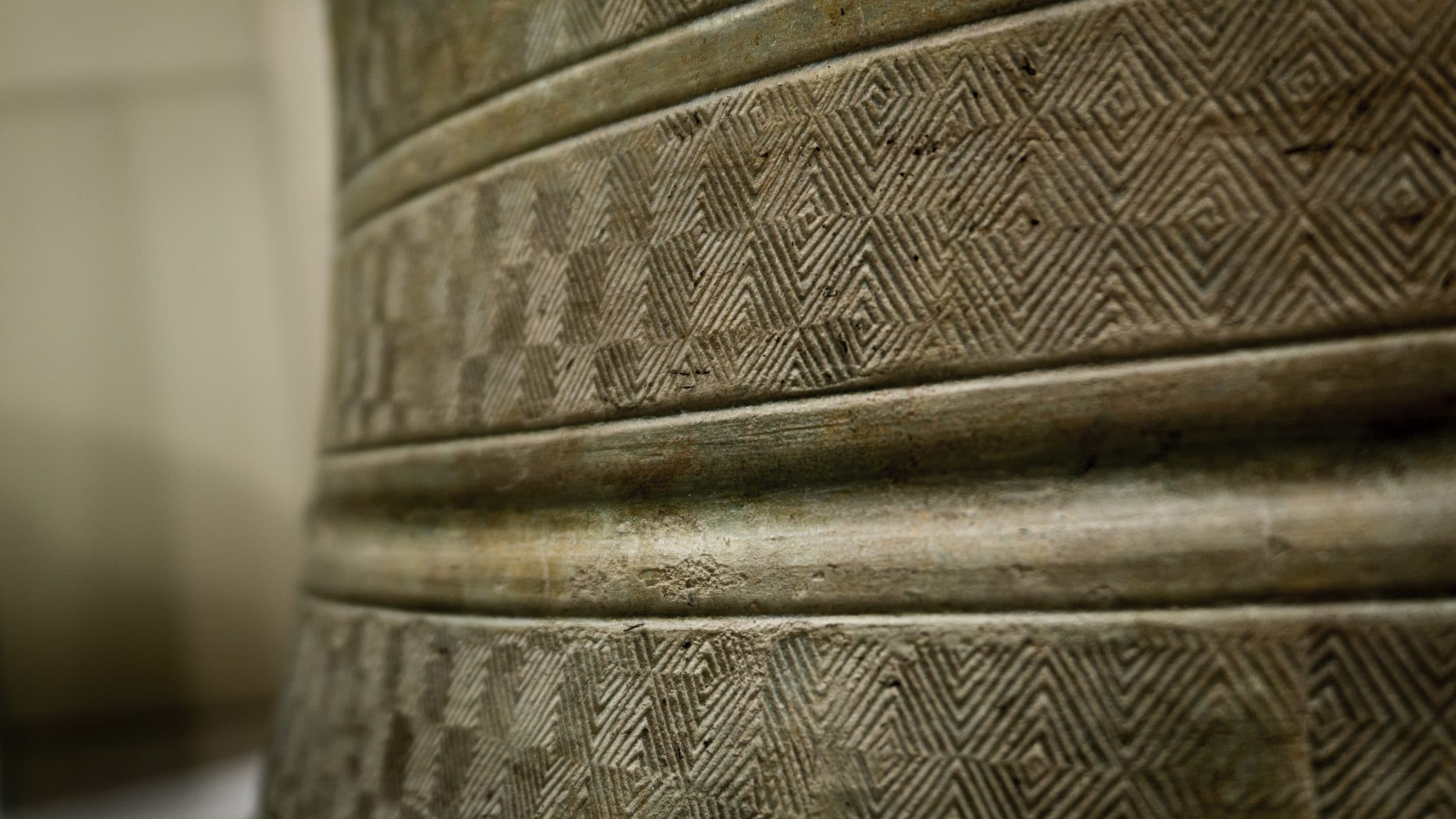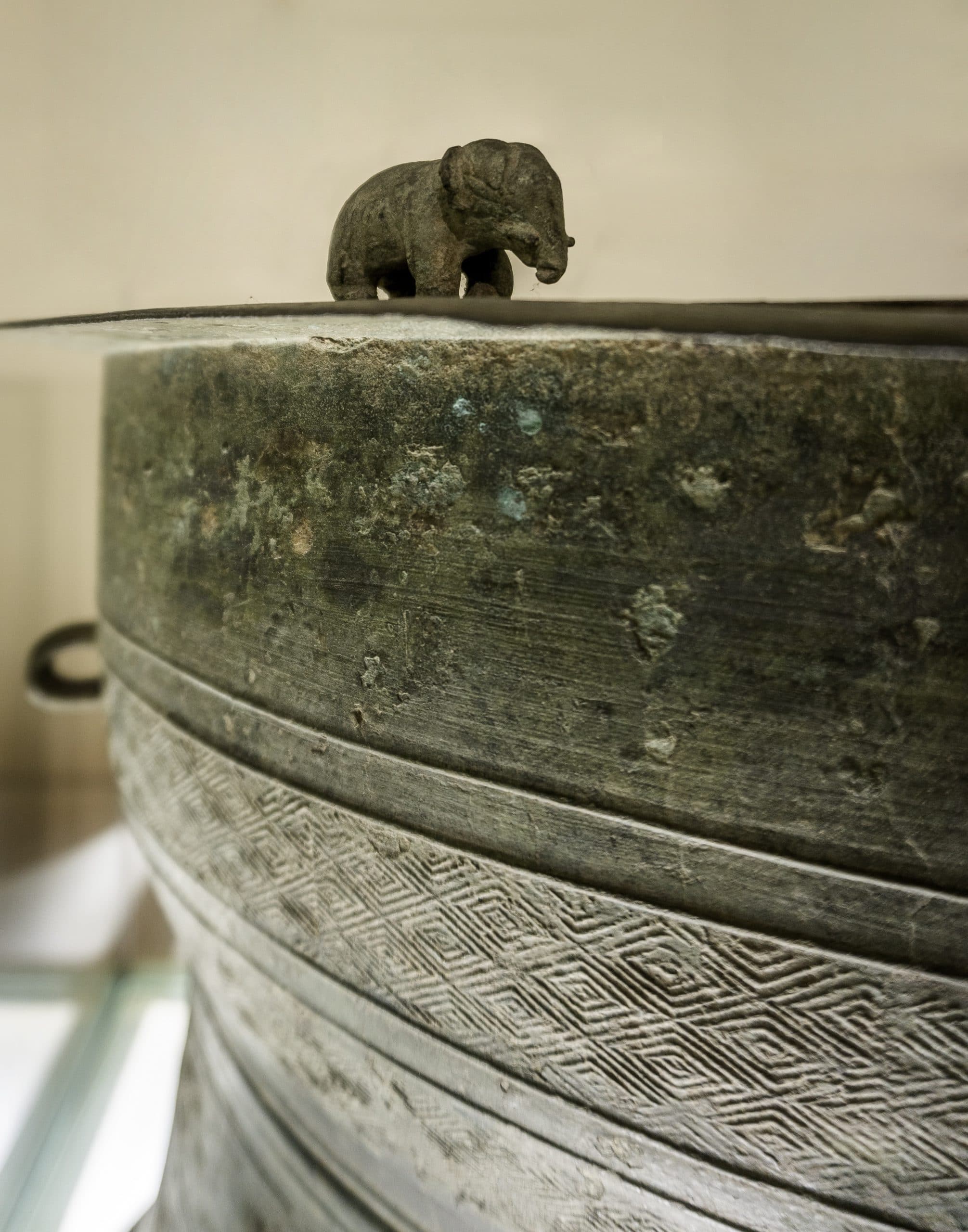 Muong drums are also decorated with patterns typical of different eras, such as meandering dragons of the Ly and Tran dynasty on the drum heads. Some patterns of Bodhi leaves, lotus leaves, and oak leaves bear similarities to Buddhist symbols from the Later Le period. They may be found on the drum’s head or body. These patterns are seen on ceramics and stone works in pagodas and palaces in the delta, as well as on Muong bronze drums in mountainous areas. This proves that harmonious exchanges of plastic arts took place in the land of Dai Viet.