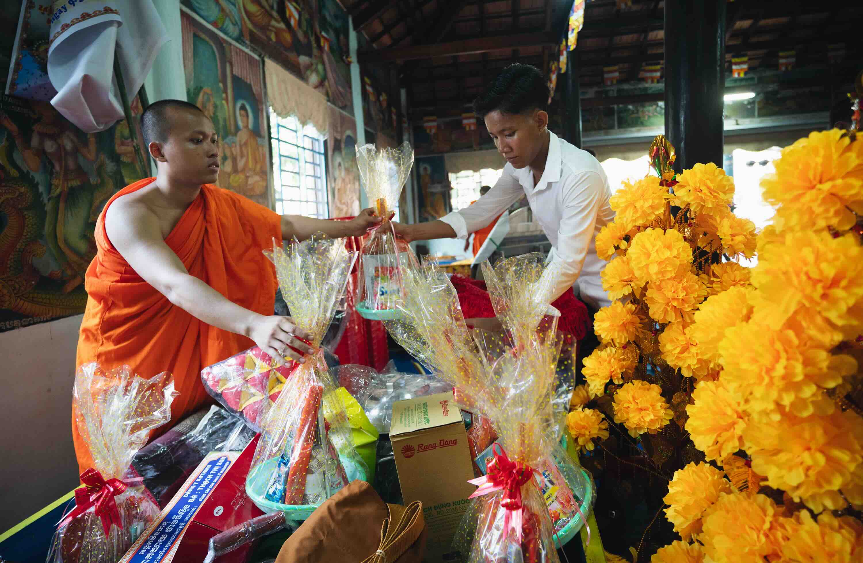 The ceremony usually spans two days. On the first day, people pray at home, with monks reciting scriptures to bless the host family. Then, lay followers organize collections of donations, including silver flower trees – trees adorned with money, also known as money trees or silver/gold-leaf trees. The donations are used to purchase offerings for the pagoda. Along with saffron robes, considered the most sacred and essential item, donated items include alms bowls, and daily necessities such as wardrobes, beds, notebooks, pens, medicine, and food. The donated items symbolize gratitude and support for the monks and nuns who have renounced worldly life.