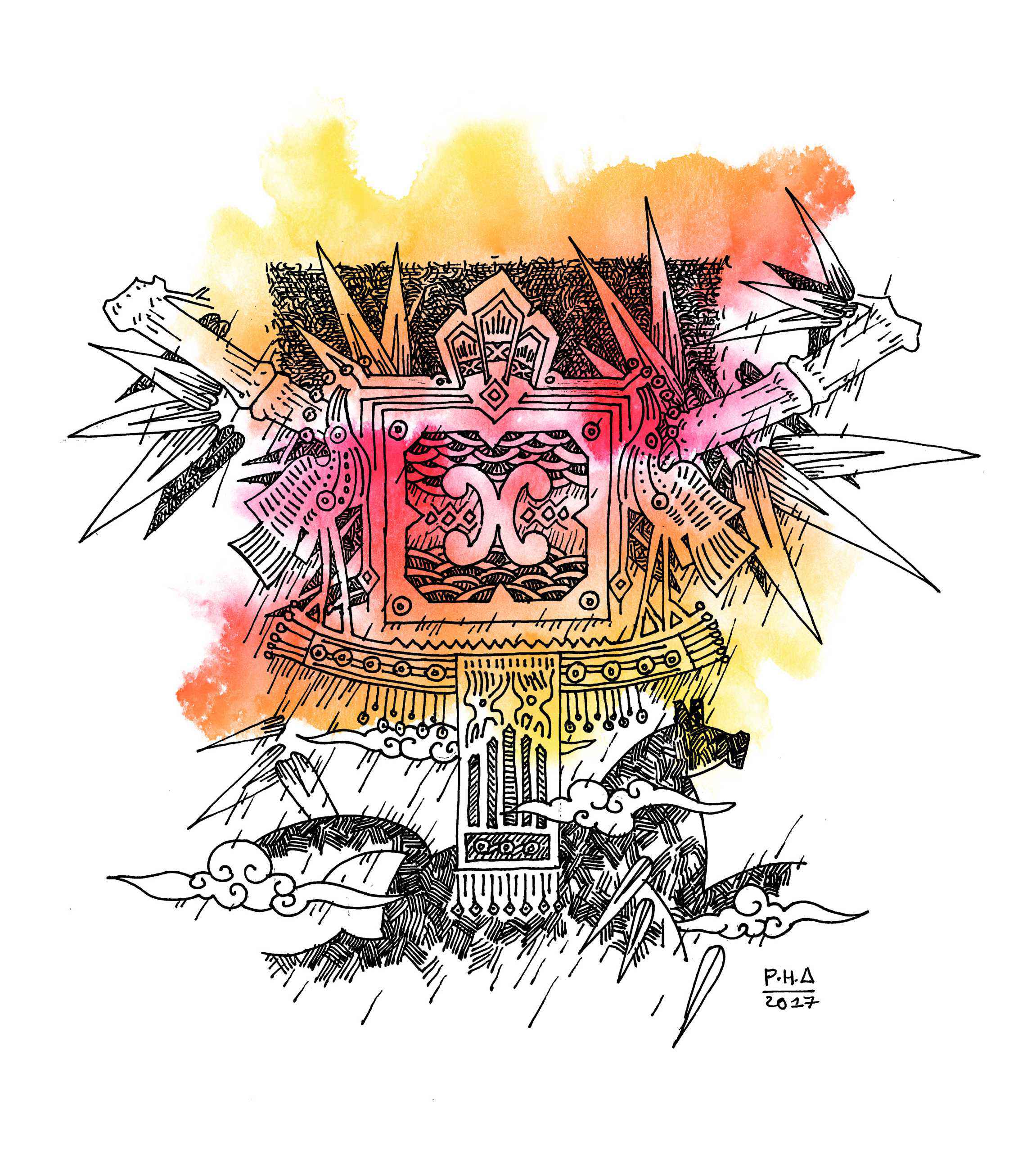 The boy’s mother cooked pot after pot of rice but Giong kept asking for more. The more he ate, the more he grew, changing from a toddler to a tall, muscular young man. When she ran out of rice, Giong’s mother asked her neighbors for help. They brought rice, sweet potatoes, buffalos, liquor, fruits and cakes. Soon, the yard was stacked high with offerings. Giong kept eating and pleading for more food.