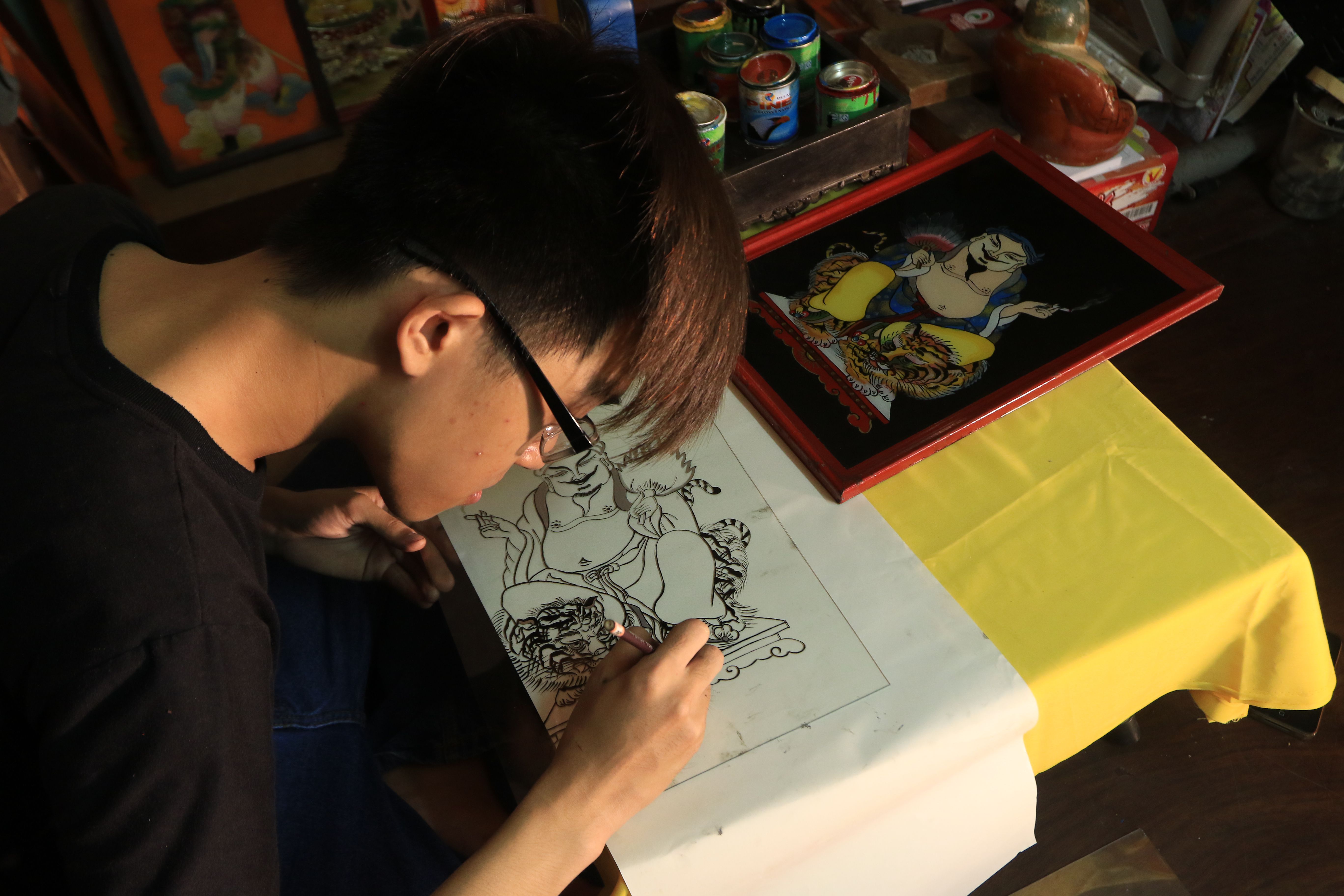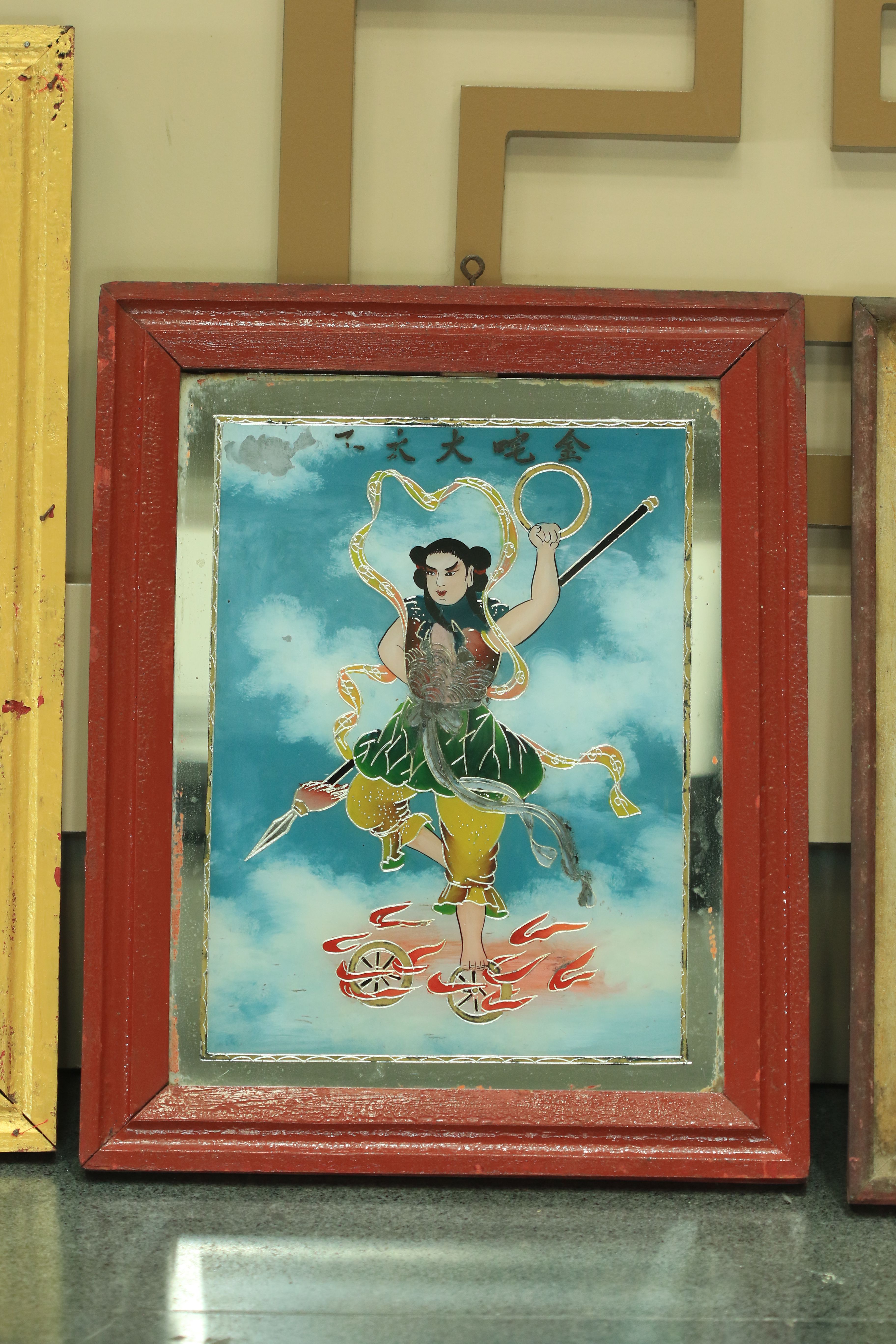Folk glass paintings first appeared in the early 20th century in Saigon’s Chinese district, Cho Lon, following the huge growth of the glass production industry. At first, these paintings portrayed demigods introduced by immigrants from Guangdong. They included religious paintings of the Saint of Guanyu (or Yunchang, a legendary general in the Three Kingdoms era), the Five Dukes of Buddha, the Great Evil Faced Taoist, and Buddhist themes such as the Guanyin of the Southern Sea or Bodhi Dama.