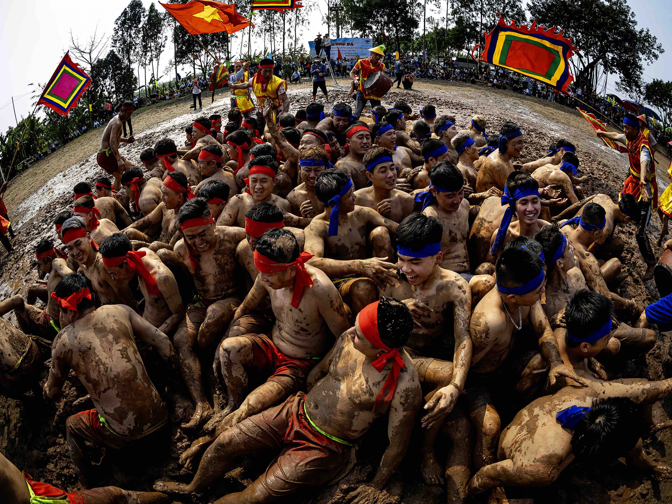 According to local lore, the village’s tutelary god Vu Quang Chieu started these wrestling games to mimic the floating river life of his sworn brother Pham Cong Nghi. The wrestling event involves 72 participants divided into two teams of 36, dressed in red or blue. One team represents the Upper Village while the other represents the Lower Village. The teams are led by three captains elected by the villagers: one serves as the overall commander and two others as flag bearers, each leading one team.