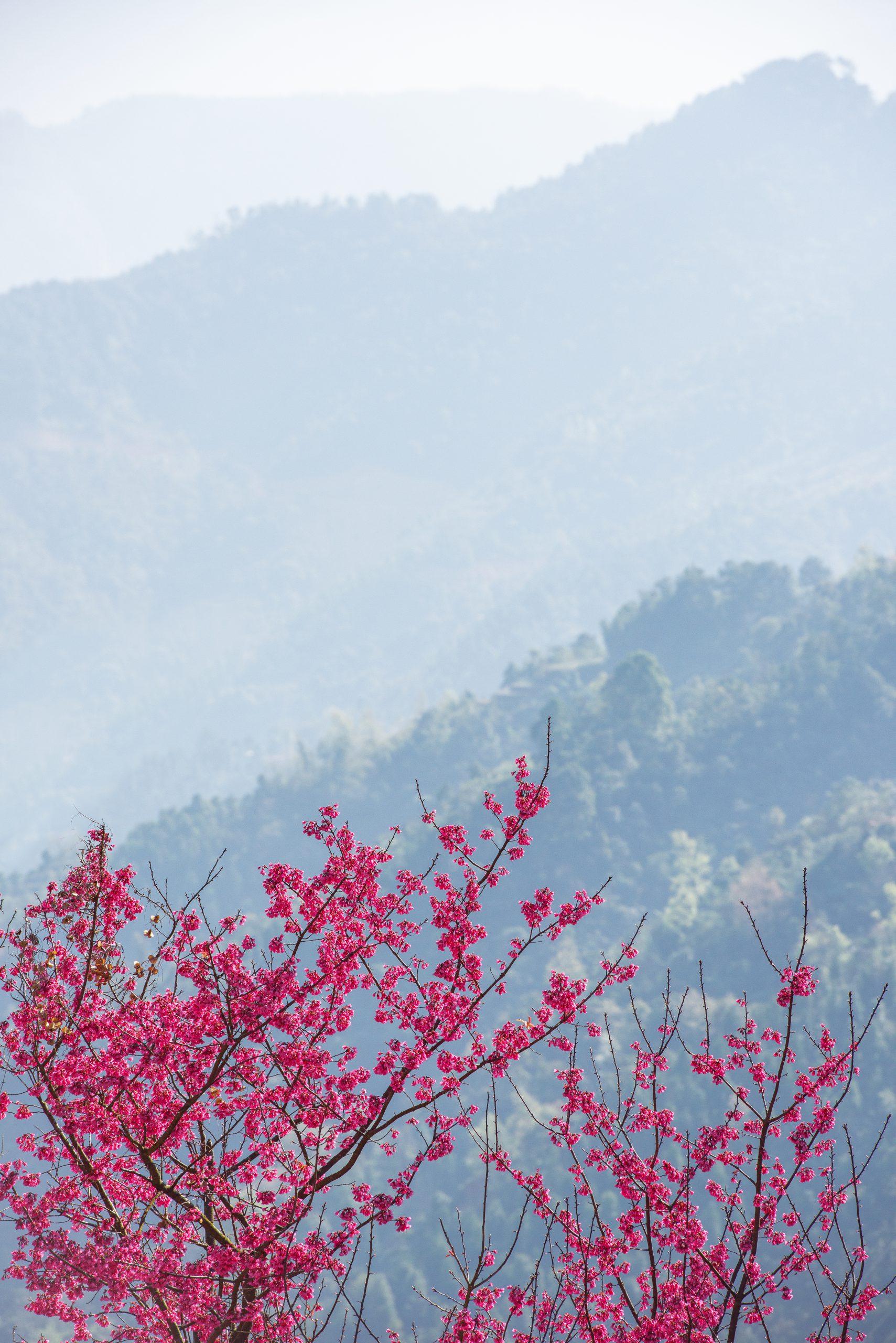 Another species of small tree with bell-shaped flowers that blooms during the Lunar New Year is Prunus campanulata, found on Mau Son Mountain in Cong Son Commune, Cao Loc District, 30km from Lang Son City. Several hundreds of these small trees dot the mountain’s ridge. Every year, Lang Son photographer Thuan Bui trudges through villages of Dao Lu Gang ethnic minority people and along narrow mountain trails at a precarious height of 800m in search of the most beautiful blossoming trees.