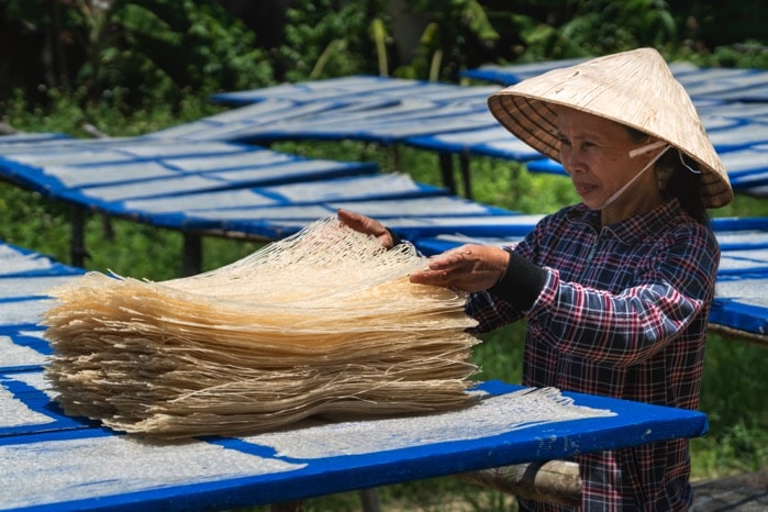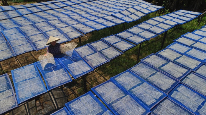 The last step is drying, with the phở strands spread evenly on rectangular bamboo racks that are neatly arranged on prepared stakes. The locals take advantage of sunny days to dry the strands of cassava phở quickly, ensuring they will be crunchy and transparent.