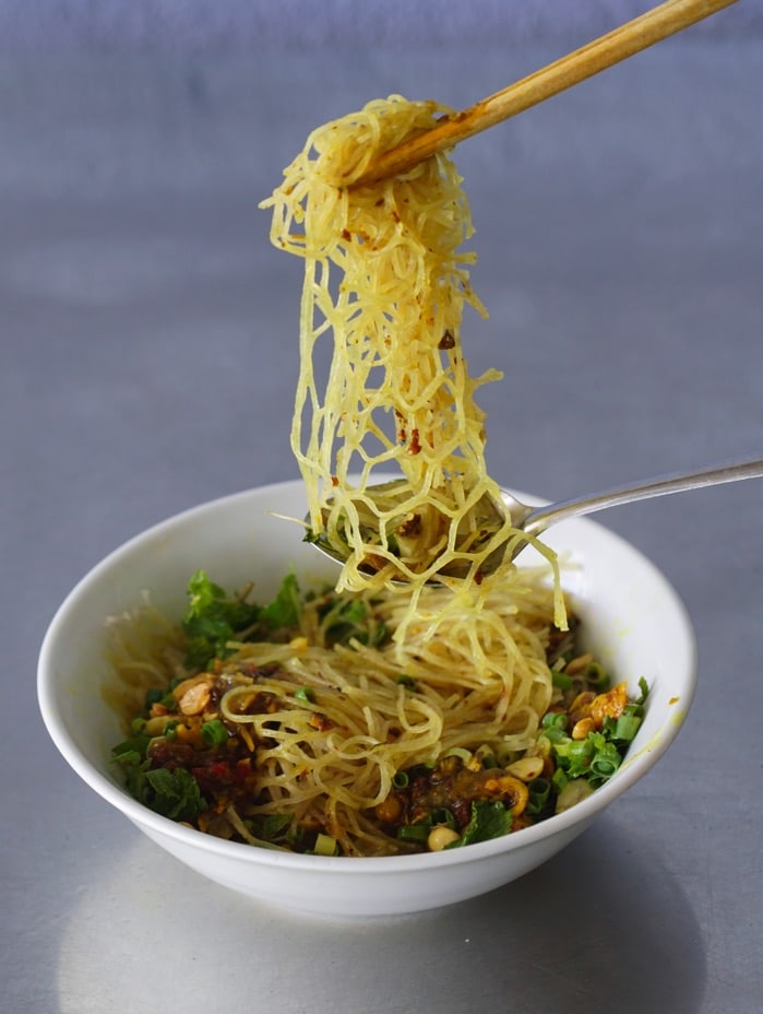 While cassava phở is used to make many dishes, the best one is cassava phở with snakehead fish. First the phở is crumbled into pieces, soaked in cold water for three minutes, put into a filter, left to dry and presented in a bowl. Washed snakehead fish is sliced and marinated with spices, while the bones are pounded to make broth. The fried fish is served with herbs like thinly sliced banana trunk, basil, cilantro and mugwort leaves. Other additions include pounded roasted peanuts, lemon extract and fish sauce with chili and garlic.