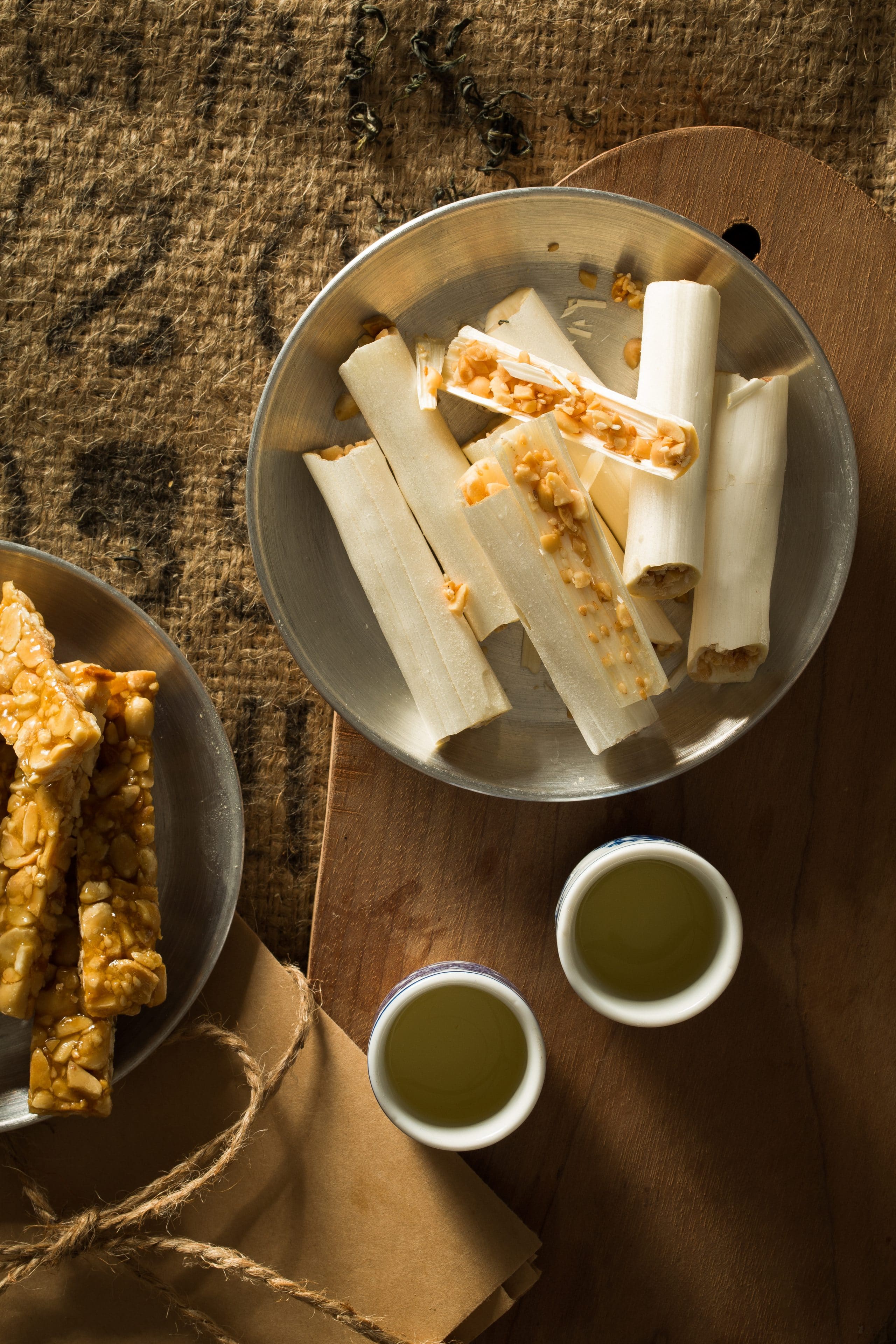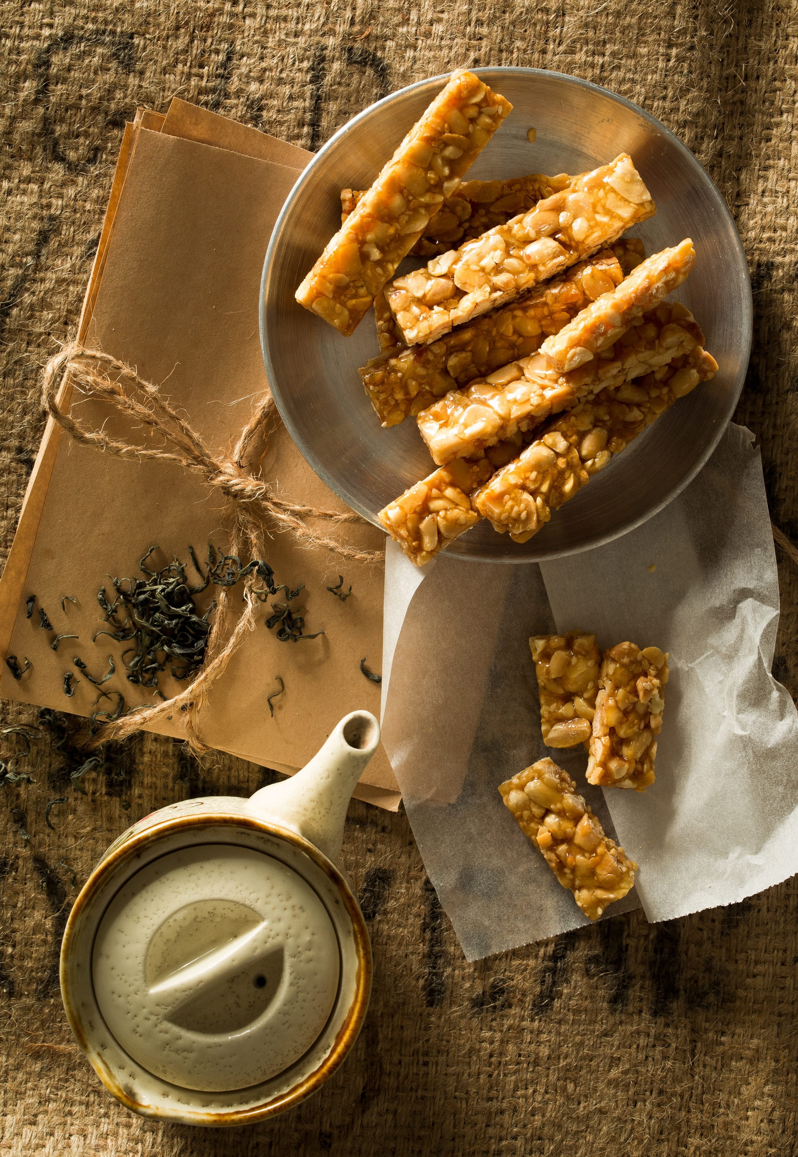 Peanut brittle and tea go very together well. Street vendors sell tea and peanut brittle bars from small stands all over the country. The peanut brittle bars are made with whole peanuts, sesame seeds, refined sugar, malt and glutinous rice flour. The bars are hard and crunchy with a sweet, buttery taste. They make a great compliment to mild tea.
