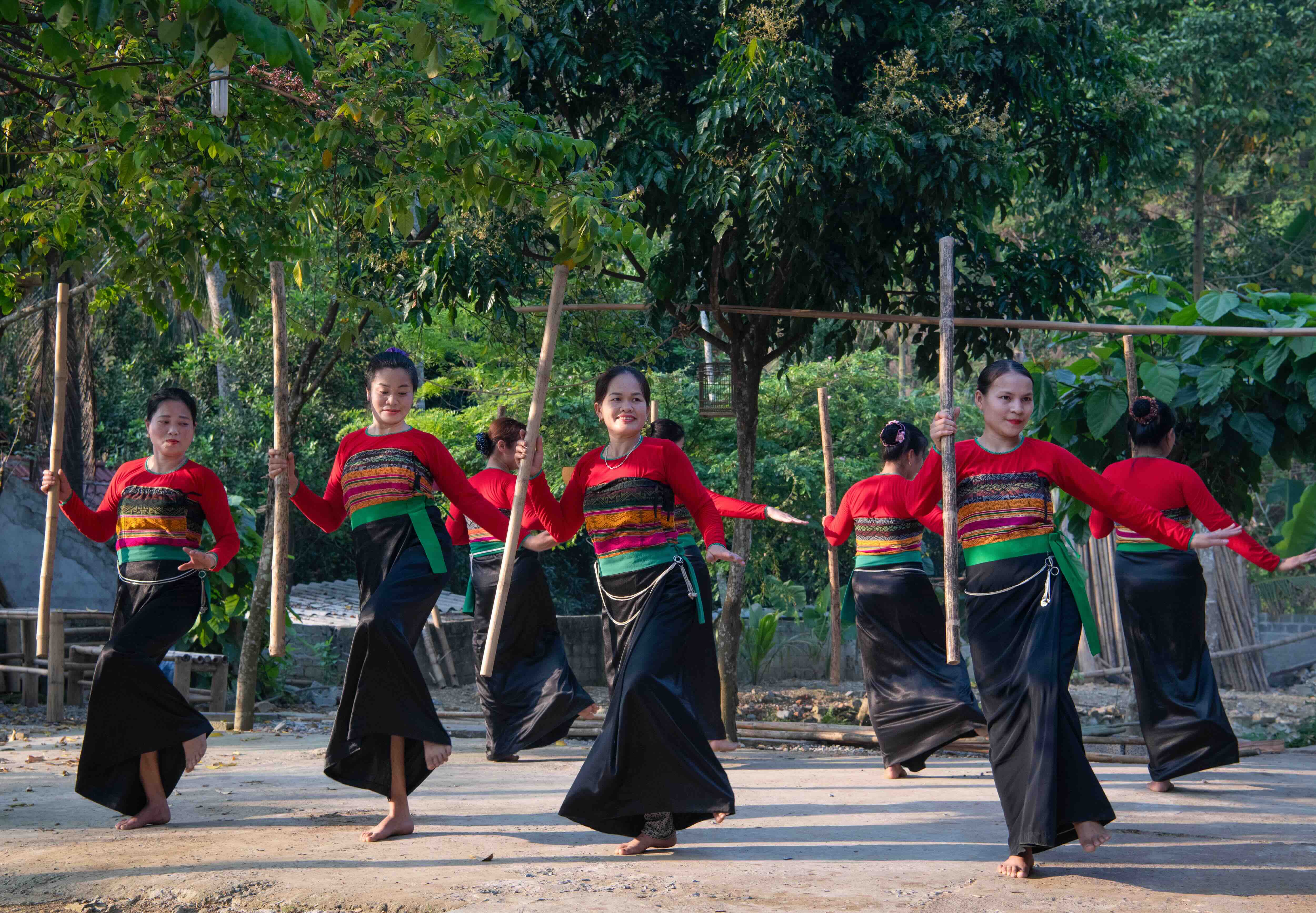 Basic Xoe movements involve raising the hands, opening the arms, lowering them, then joining hands with the next person while stepping in rhythm. Dancers lean back slightly with their chests lifted. The dance is usually accompanied by instruments such as the tính tẩu (gourd lute), kèn loa (horn), khèn bè (bamboo mouth organ), drums, gongs, and cymbals, played in a steady 2/4 or 4/4 beat. Though the movements are simple, they express hopes for a good life and strong community bonds.