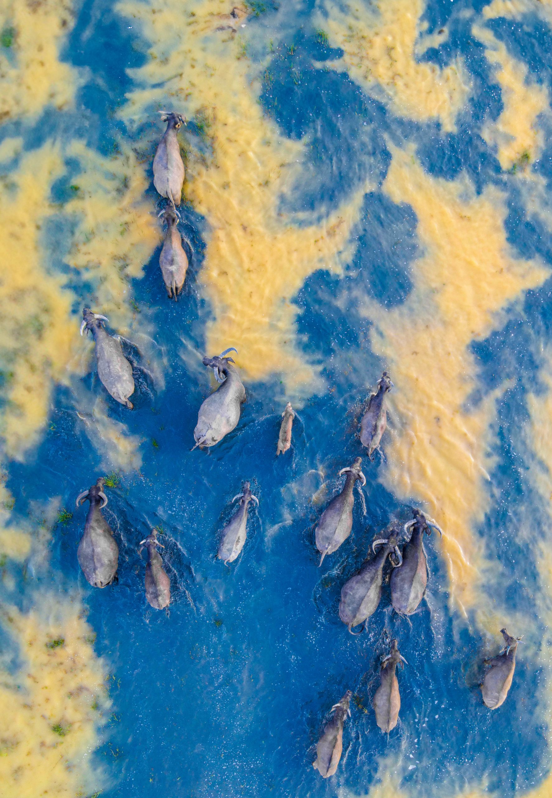 Captured from above, scenes of buffalo herds moving across green fields create memorable panoramas. Indeed, letting the buffaloes out to roam is a way to thank them for their year-round hard work in the fields.