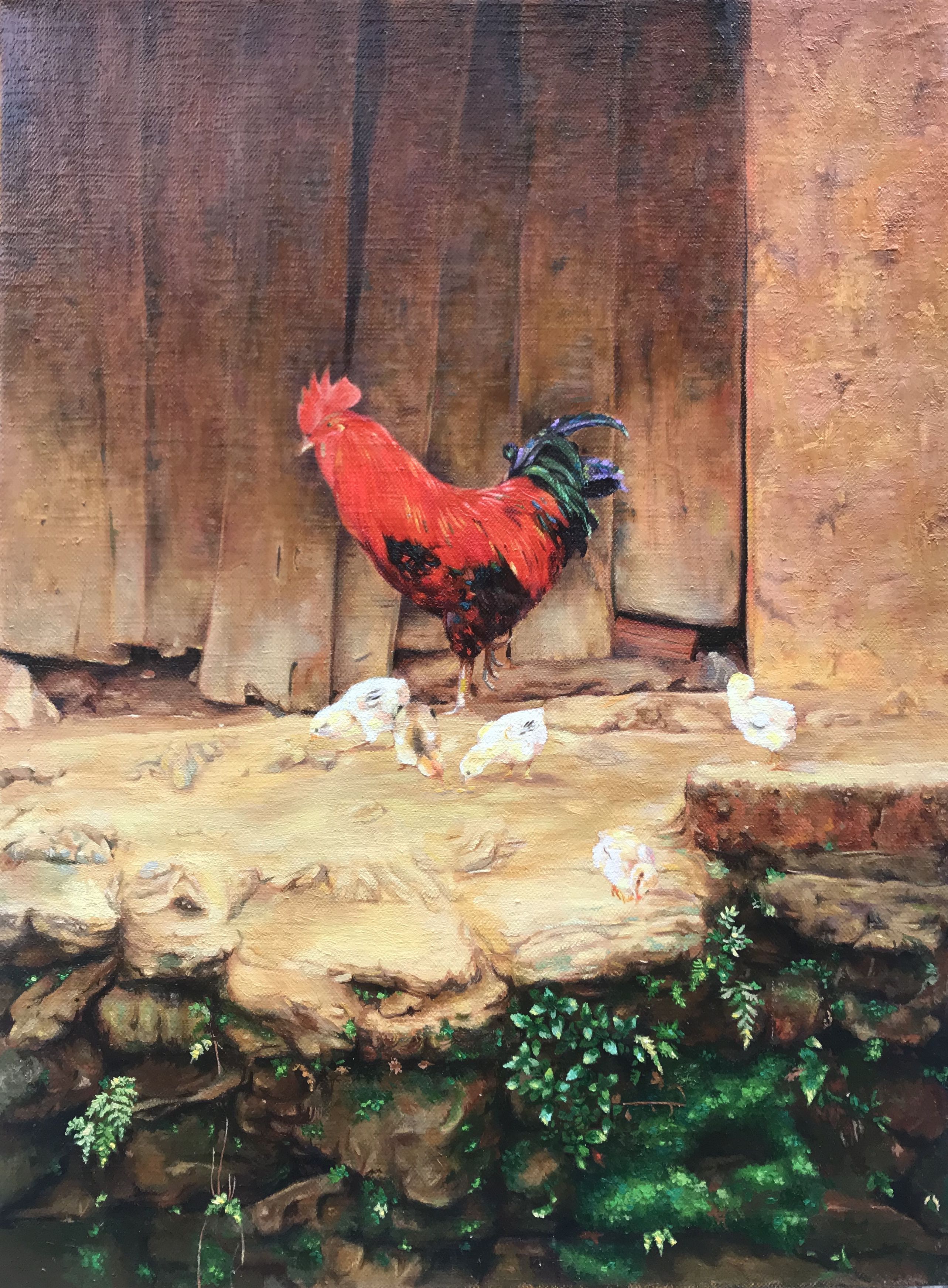 From a realistic point of view, Chu Viet Cuong’s “Tay Nguyen” (Central Highlands) and Nguyen Minh Dong’s “Bên rừng” (By the forest) take the audience to a peaceful space with traditional communal houses and tall trees that have been protecting the people of the Central Highlands since the beginning of time, like Mother Nature. Still under the theme of daily moments, life in the Northern mountainous is depicted as simple through the image of a flock of chickens in the work “Sang o Coc Ma” (Morning in Coc Ma) by Nguyen Le Tan, or cozy wooden houses in the middle of a buckwheat field in Nguyen Minh Dong’s “Sương qua bản” (Fog passing through the village). On the same topic of nature, Hue artist Nguyen An has a very different feeling about the rain on the mountains. In his series of paintings “Mua cao nguyen I;II;III” (Rain on the highlands I;II;III), the mountains and forests are elusive in the rain. The rainy season in the mountains seems never-ending, and nature sings its songs throughout the mountain ridges, rivers and streams, and communal houses. The lacquer on paper technique employed for these paintings is also an interesting and different use of this material.