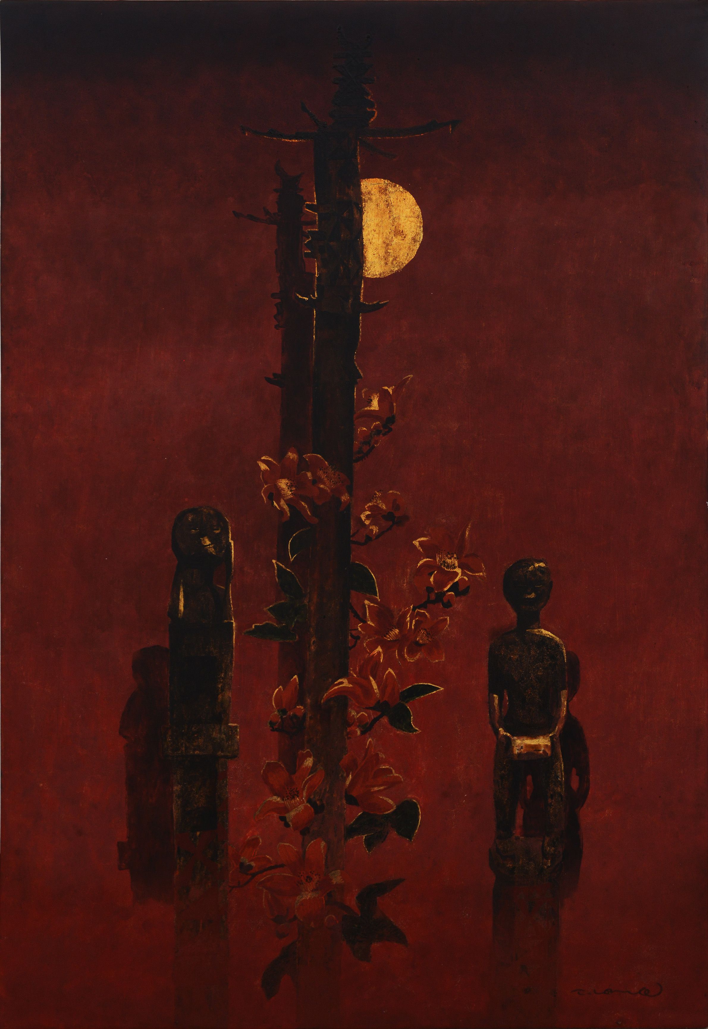 Regarding lacquer painting, artists have fully explored the abstract nature of Vietnamese lacquer to introduce audiences to changing shades in their paintings. As a painter renowned for his mastery of this material, Nguyen Truong Linh has employed new techniques to create magical novel effects with this material in his works “Dam San” and “Di tom loi ru mat troi” (Chasing the lullaby of the sun). Inspired by the epic “Dam San seeks to marry the Goddess of the Sun”, his series of paintings praises the splendor of nature and the heroic blood that flows in the veins of the people in the Central Highlands. On the other hand, the collection “Tieng vong qua khu I;II” (Echoes from the past I;II) by Nguyen Xuan Luc is heavily influenced by surrealism, depicting memories of the central highlanders’ sacred and mysterious beliefs with motifs of grave house statues. In “Tieng vong” (The echo) by Tran Tuan Long, the main vermillion color evokes the image of a sacred space with statues that have stood for a thousand years, and the cold moonlight that seems to resound like an echo of a historical epic. Meanwhile, black and puce paint are used appropriately in combination with a modern style to create strong emotions, as felt in the wonders of Dao Minh Tuan in “Earth, Water, Fire” – the indispensable elements in nature that bring life to humanity but also death to those who do not appreciate the values of nature. The lacquer painting on canvas “Khong gian mien nui” (Mountainous space) by Nguyen The Hung preserves the entire solemn atmosphere of the Northern Highlands.