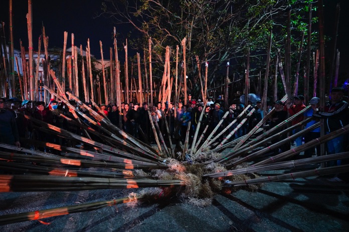 Each family sends a man bearing a 4.5m-long bamboo torch to the communal house as their representative. When the countdown to the new lunar year begins, the head priest opens the communal house’s gates and asks the village god to share the sacred flame with the villagers for the festivity. Cheered on by the crowd, the sacred flame is brought into the communal house’s yard. Everyone hurries toward the sacred flame and uses it to light their own torches. As the villagers carry these torches back home, every street and alley is filled with the sounds of cheerful footsteps, joyous laughter, and New Year’s wishes.