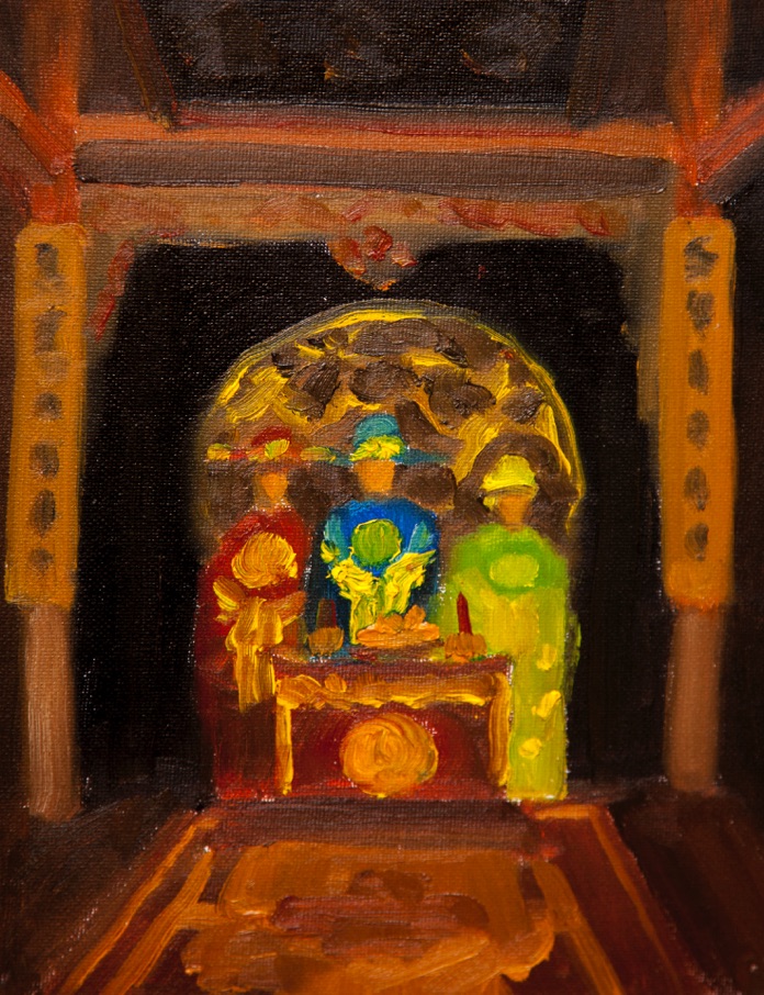 Impressed by their sincerity, the Emperor of the Underworld decided to help them to stay together. He turned them into the three stones of the kitchen fire. They would always be able to see each other, and the fire would warm up their love for each other. He also gave them the roles of Kitchen Gods, to watch over all families on earth.