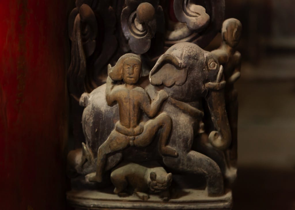 During a visit to Diem village, as well as enjoying Quan Họ melodies, tourists can admire a site that was recognized as a National Treasure by the State in 2020. This is “Cửa võng” – the hand-carved wooden door frame of Diem village’s communal house. This 300-year-old artifact is made from gilded wood and stands seven-meters high and 3.9-meters wide. It extends from the communal house’s ceiling to the floor. All five levels are decorated with magnificent carvings of the Four Spirits – dragons, kirins, turtles, and phoenixes. The carving techniques are sophisticated, including peel-style, embossing, and chisel-style. The long-ago artisans put their heart and soul into portraying themselves through images of an elderly man playing chess, a woman sitting on a dragon’s back, and a man in a loincloth and turban riding an elephant with his arms and legs spread wide and a joyful smile on his face. One notable carving, rarely seen in ancient sculpting art, depicts a beautiful and realistic horse next to a horseman in a turban, who holds the horse’s mane.