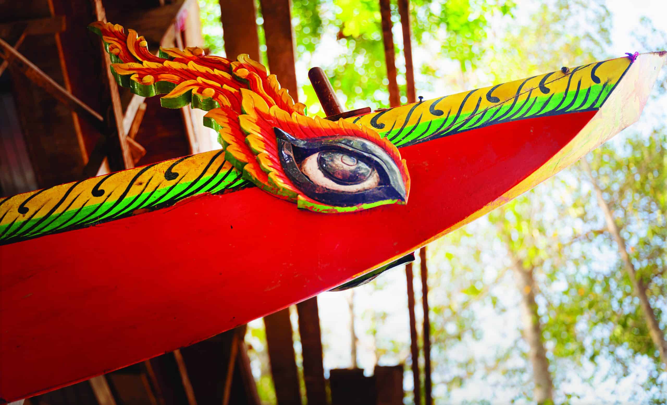 Once a boat is finished, the temple invites renowned artists like the husband and wife team Lam Phien and Son Sa The, painter Danh Thanh Dat, or skilled monks, to paint traditional motifs on the boat, such as dragon scales and mythical serpents inspired by the naga, along with other traditional patterns. The carved wooden eyes on the boat’s bow are a spiritual feature, symbolizing the boat as a water creature in need of eyes to navigate safely. Each boat also bears a unique animal emblem, such as a tiger for Champa Temple (Chau Thanh, Soc Trang) or an eagle for Wath Pich Temple (Vinh Chau, Soc Trang). These creatures also symbolize the desire for speed and agility during the races. The ngo boats are carefully stored in the temples. Every significant event related to these boats involves solemn traditional ceremonies, including rituals to mark the commencement, completion, and launch of the boat.