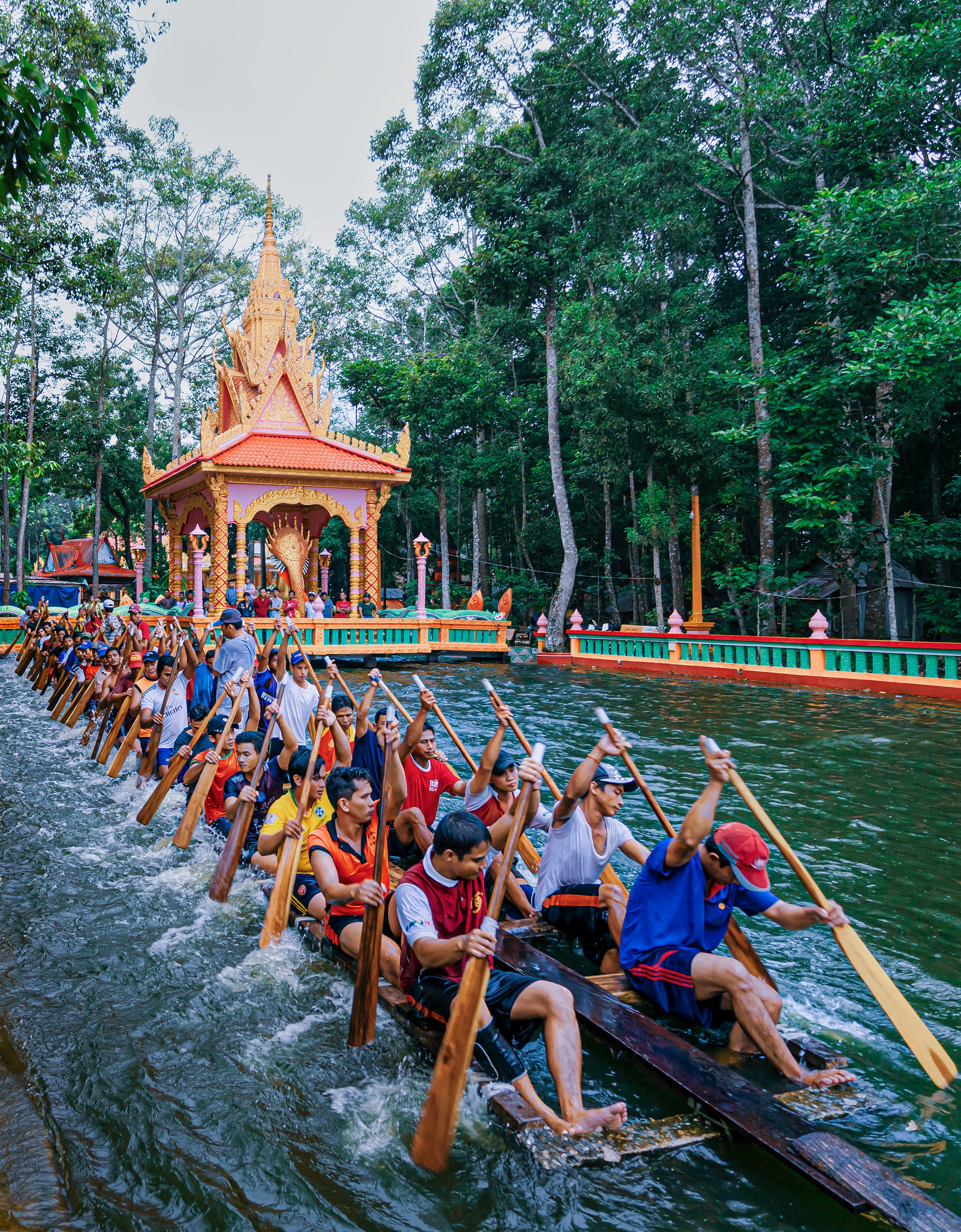 The 2009 book The Origin of ‘Ngo’ Boat Racing Festivals, Water Lantern Festivals, and Moon Worship by the monk Thach So Tum recounts how, according to historical records, “The boat racing festival has been a tradition for inhabitants of the ancient Ba Sac region (now Soc Trang) since around the year 2071 of the Buddhist calendar, which corresponds to 1528 of the Gregorian calendar.” The first recorded festival took place on the Pem Kon Tho River (now known as the Vam Du Tho, My Xuyen, and Soc Trang rivers). This event was later moved to the Prek Om Pu Yea River (now the Nhu Gia River, My Xuyen). In the 1980s, this festival was again relocated to the Kinh Xang River, also known as the Sung Dinh River (Maspero River, Soc Trang City), where it is still held today.