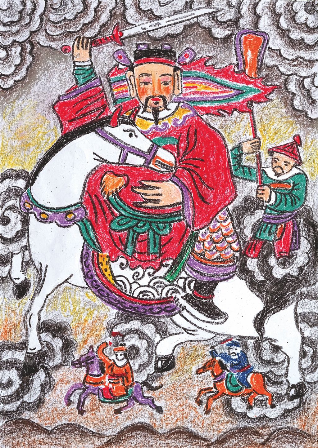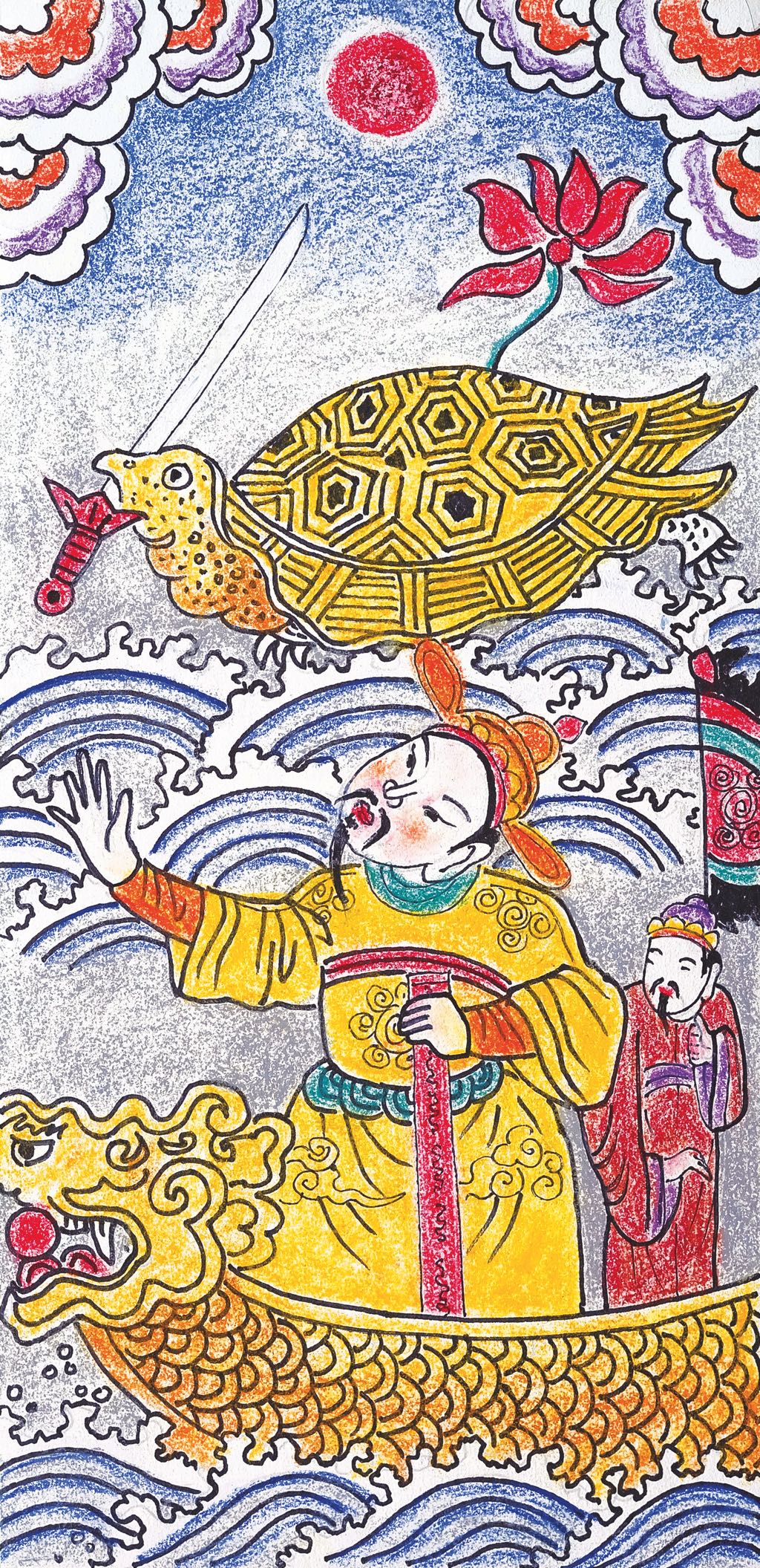 The emperor immediately understood and unsheathed the blade. All at once, the sacred blade flew from his hands towards the golden turtle. The turtle opened its mouth and held the blade lengthwise, then dove into the lake. Long after the turtle vanished, a glimmering flash could be seen on the lake’s green surface.