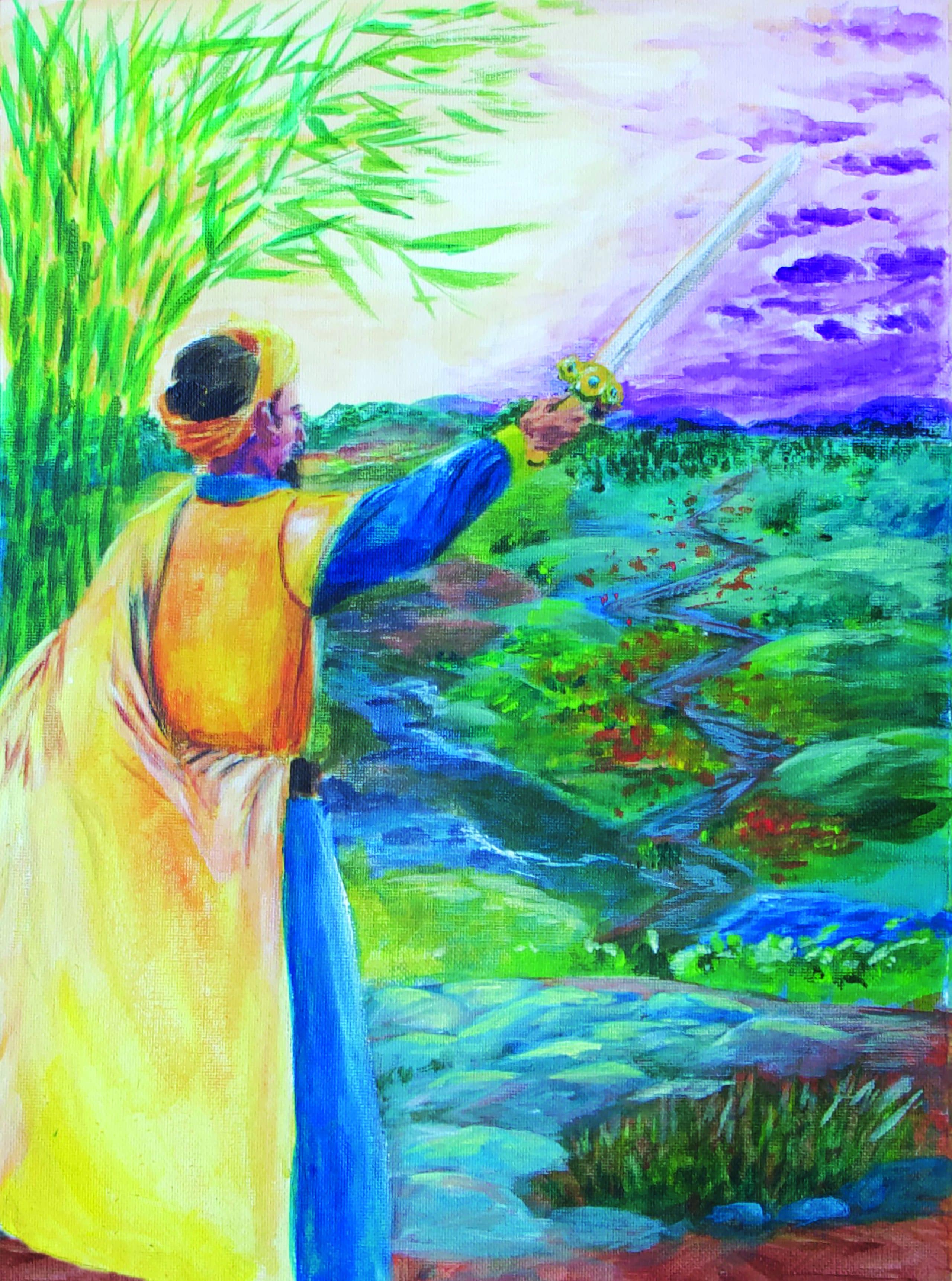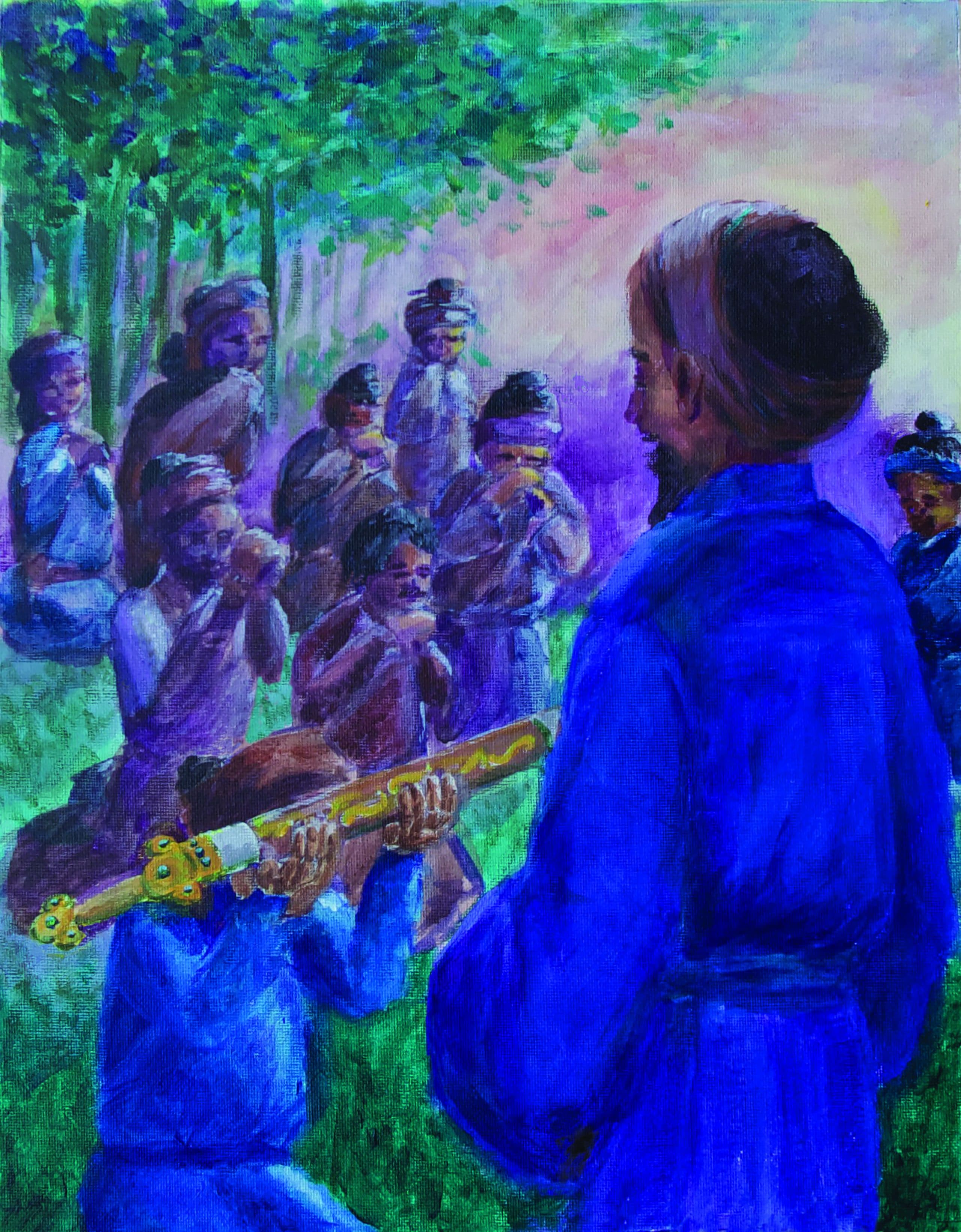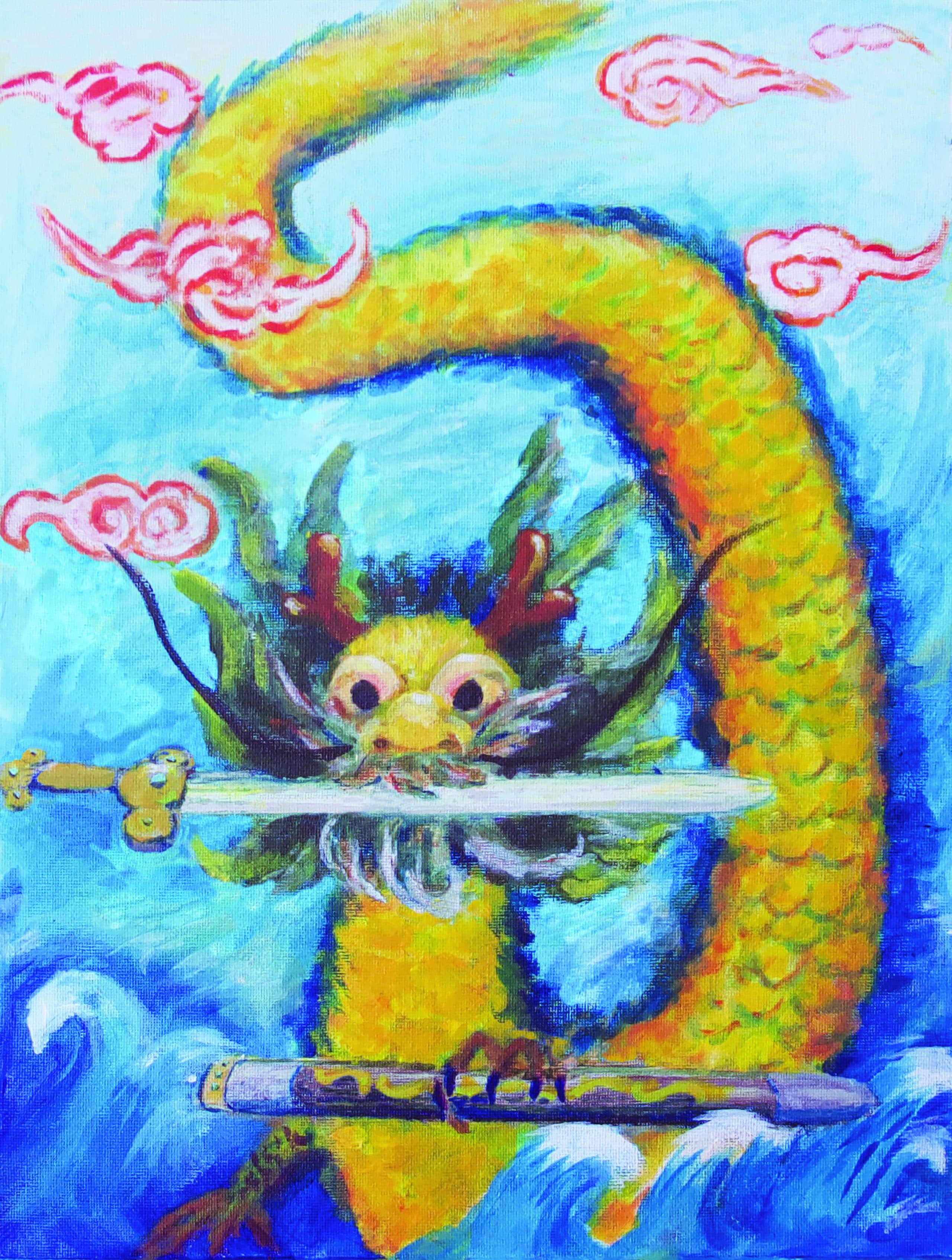 The emperor immediately understood and unsheathed the blade. All at once, the sacred blade flew from his hands towards the golden turtle. The turtle opened its mouth and held the blade lengthwise, then dove into the lake. Long after the turtle vanished, a glimmering flash could be seen on the lake’s green surface.