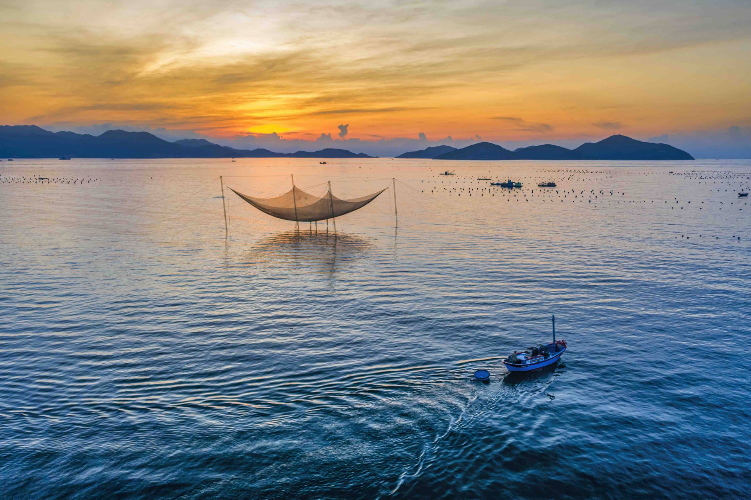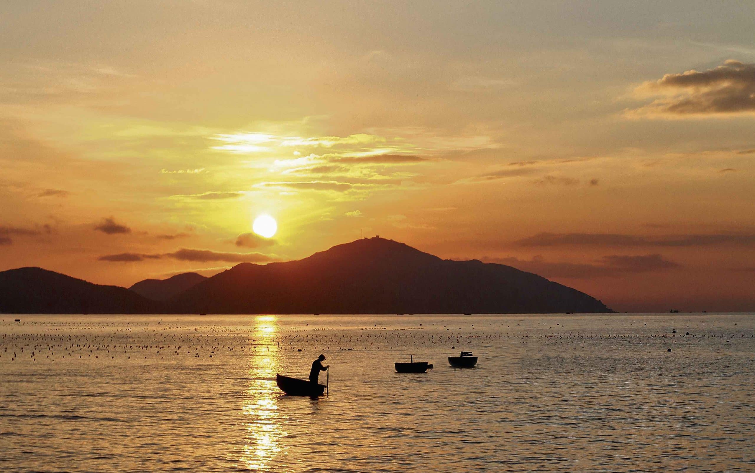 As dawn broke over the sea, casting a golden glow on the clouds, with the distant mountains of Cam Nghia still shrouded in darkness, we climbed a low hillside, mesmerized by the green boats crisscrossing the sea and the giant fishing nets being slowly lifted, their mesh glinting, heavy with the ocean’s bounty. As the sun rose higher, a few small boats carrying tourists skimmed across the sea, tracing graceful white arcs of foam like dancers on a blue stage. The scenery was breathtaking!