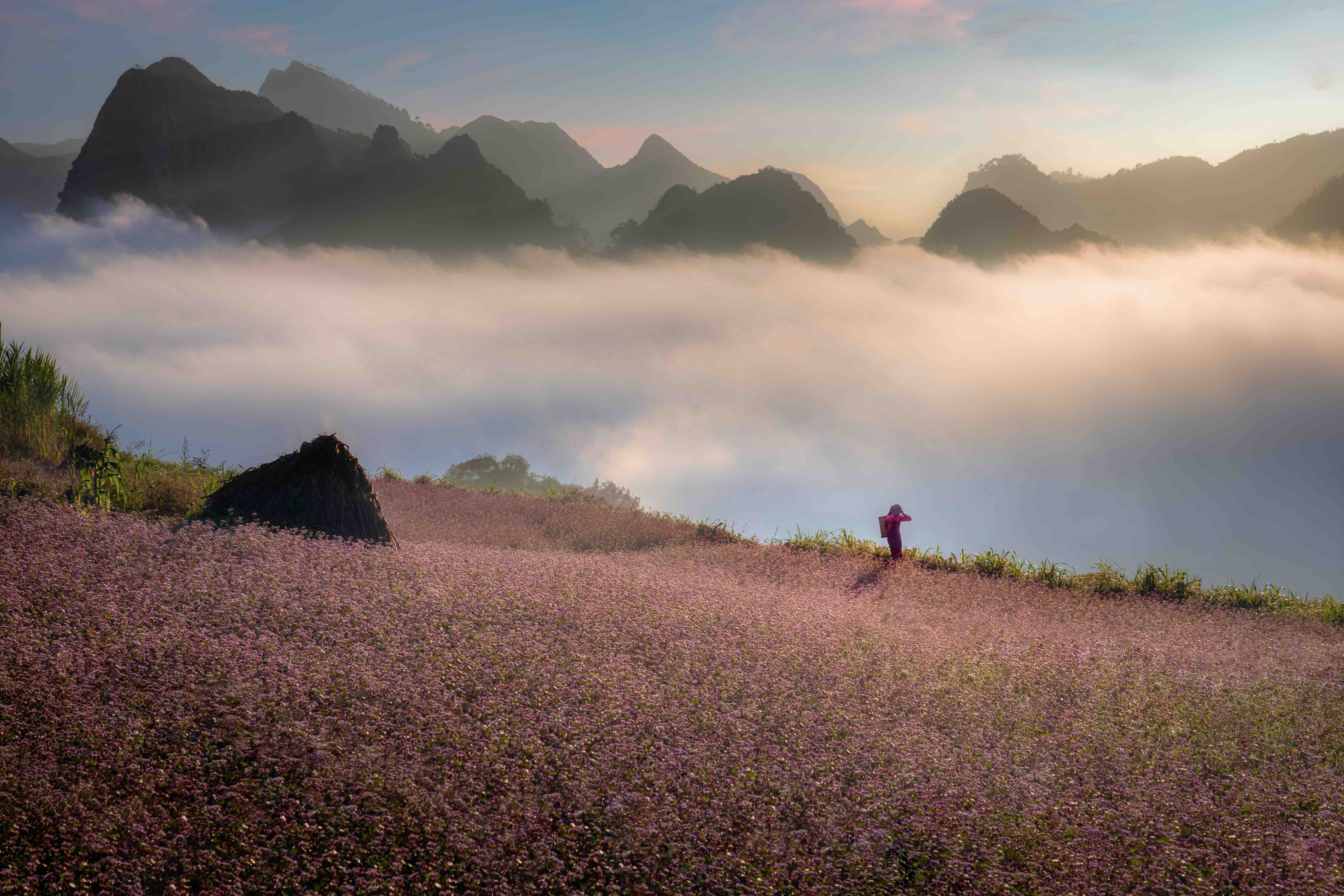 Today, buckwheat is widely grown in the communes of Dong Van, Quan Ba, Yen Minh, and Meo Vac. During the peak blooming season, travelers can easily spot sweeping valleys of flowers along National Highway 4C – through Quan Ba, Sa Phin, the foot of Ma Pi Leng Pass, around Lung Cu Flag Tower, and in the Dong Van Old Quarter. The scenery is especially striking on the vast Suoi Thau Plateau in Xin Man commune, western Tuyen Quang, and along the road leading up to Lung Cu Flag Tower, where deep abysses and layered mountains heighten these fragile flowers’ delicate beauty.