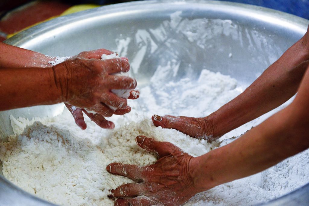 Long ago, people created these two dishes to sustain themselves during tough times. The ingredients were simple and readily available. Local elders explain how to prepare “condensed porridge”. The cook must choose good rice, wash it and soak it in cold water for eight to ten hours before it is milled. Water and rice flour are mixed to form a dense paste. The next step requires great skill and patience. The cook must knead the dough until it is smooth, then carefully drop it into a boiling porridge pot. The dough cooks immediately and rises to the surface. Visitors to this area can still see local woman sitting beside pots of porridge, kneading rice flour to prepare this rustic delicacy.