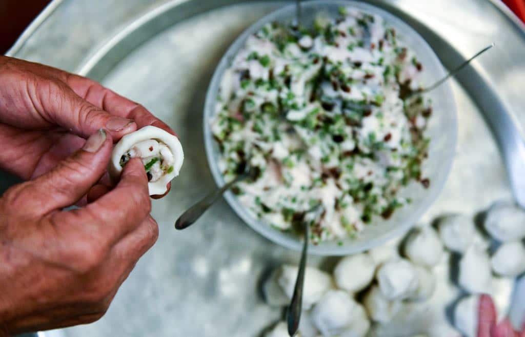 Lump cakes were once placed in baskets lined with dried banana leaves to keep warm. They are now stored in thermal barrels and sold at markets. There are two ways to eat these cakes. One, they are picked up and dipped in fish sauce with vinegar, sugar and chili. But the most popular method is to eat the lump cakes together with condensed porridge. The little cakes are dipped into the hot porridge and eaten. Every bite is hot and delicious.