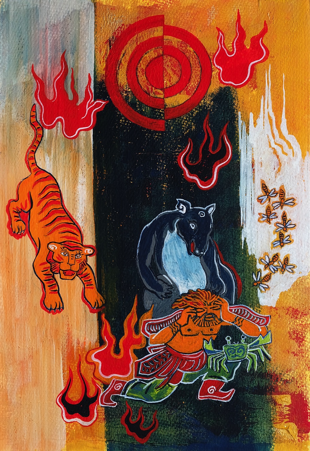 When the Thunder God got close, Toad gave a sign to the Bees. They zoomed out and stung the unlucky God’s nose. Clutching his face, the Thunder God jumped into the large jar to escape the bees. Crab was waiting. In his panic, the Thunder God broke the jar. Tiger pounced on Him.